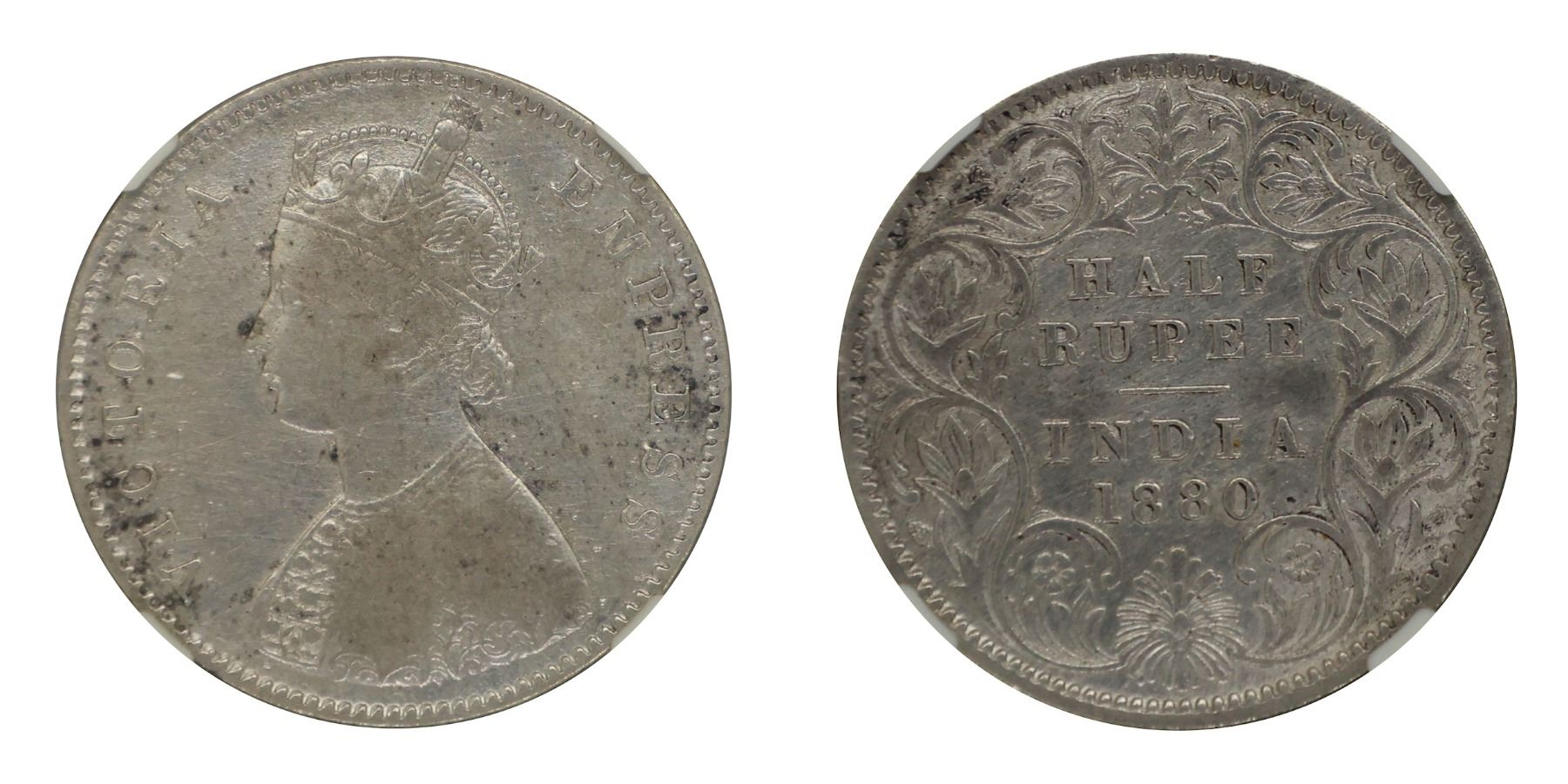 1880, Victoria Empress, Silver& nbsp;1/2 Rupee,& nbsp;Calcutta& nbsp;Mint, A/I/C incused, PR# 264, GK# 614, Graded & amp; Slabbed by NGC Fine details.