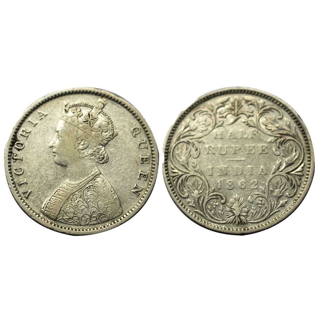 British India, Victoria Queen, 1862, Silver ½ Rupee, Bombay Mint, Round Beads on Both the Arches of the crown, Obv B1/Rev II, Pr. 258.