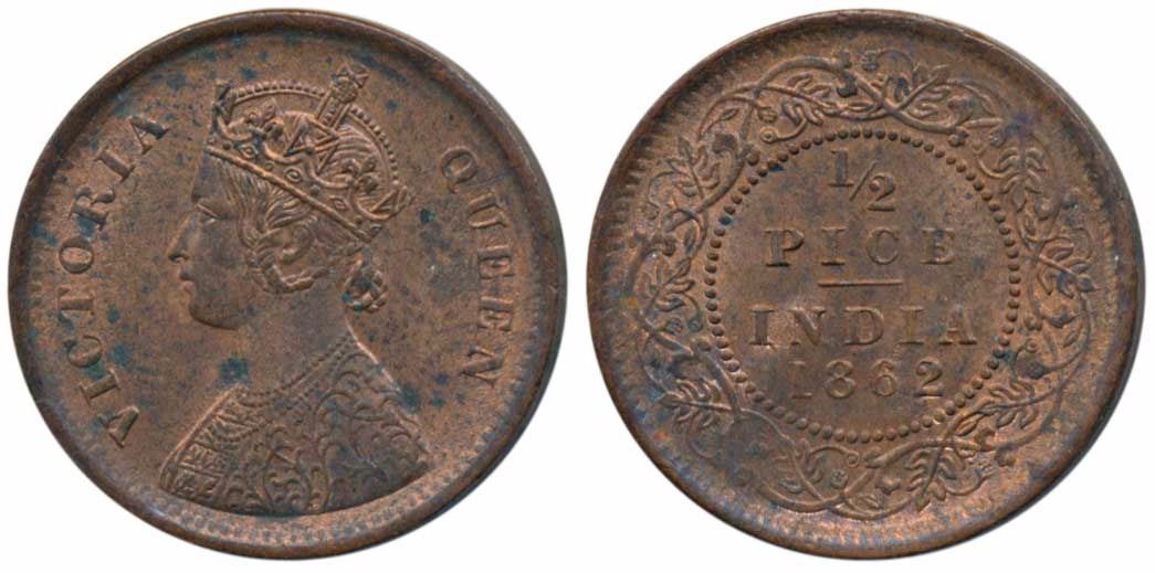 Victoria Queen, Copper ½ Pice, 1862, Madras Mint, Left stroke of v in relief in centre of the ground line of the bust, diameter 21.2mm, Pridmore erred in quoting 21.4 mm diameter that is (Prid 713). Unlisted in Pridmore. About Uncirculated, Scarce.