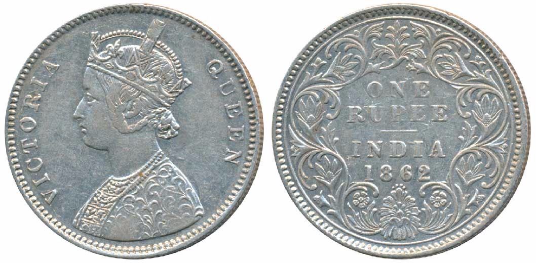 Victoria Queen, Silver Rupee, 1862, Bombay Mint, A / I / 0 / 5, One smaller dot on the punched later (to the right of the 4 dots) to a used I / 0 / 4 rev. die, Unlisted in Pridmore. Very Fine+, Very Rare.