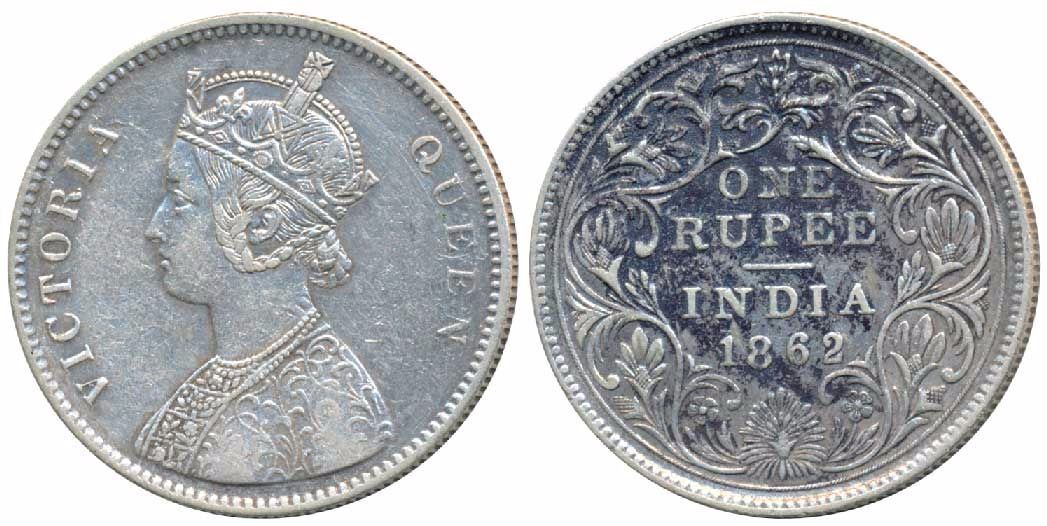 Victoria Queen, Silver Rupee, 1862, Calcutta Mint, A / II, plain cone over E of ONE and rest three buds are pineapple like, similar to Prid 63 but obv. with a cresent & V, unlisted in Pridmore. Very Fine+, Very Rare to find this type with crescent.