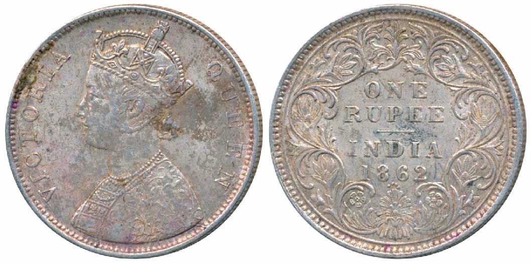 Victoria Queen, Silver Rupee, 1862, Bombay Mint, B / I / 0 / 6, two smaller dots added later to a used I / 0 / 4 rev. die, Unlisted in Pridmore. Very Fine, Very Rare.
