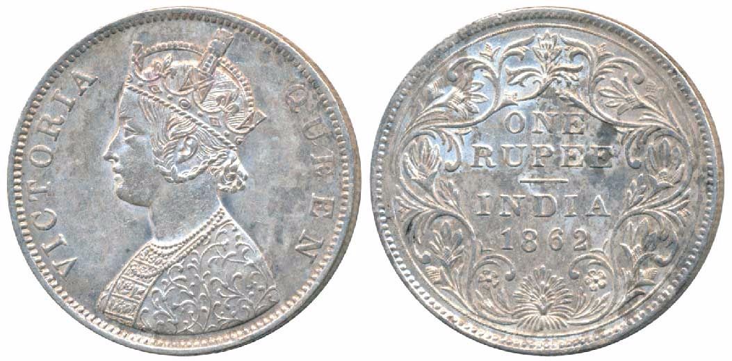 Victoria Queen, Silver Rupee, 1862, Calcutta Mint, B / II, with pineapple cone over O of One, round pearls in the crown, (Prid 54). Extremely Fine, Rare.
