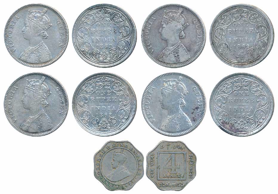 Victoria Queen, Silver Rupee, 1862 (4), A / II / 0 / 7, (2), A / II / 0 / 10, (2), George V, Cupro-Nickel 4 Annas, 1921, Bombay Mint, (Prid 87, 93 879). Fine to Very Fine. (5)
