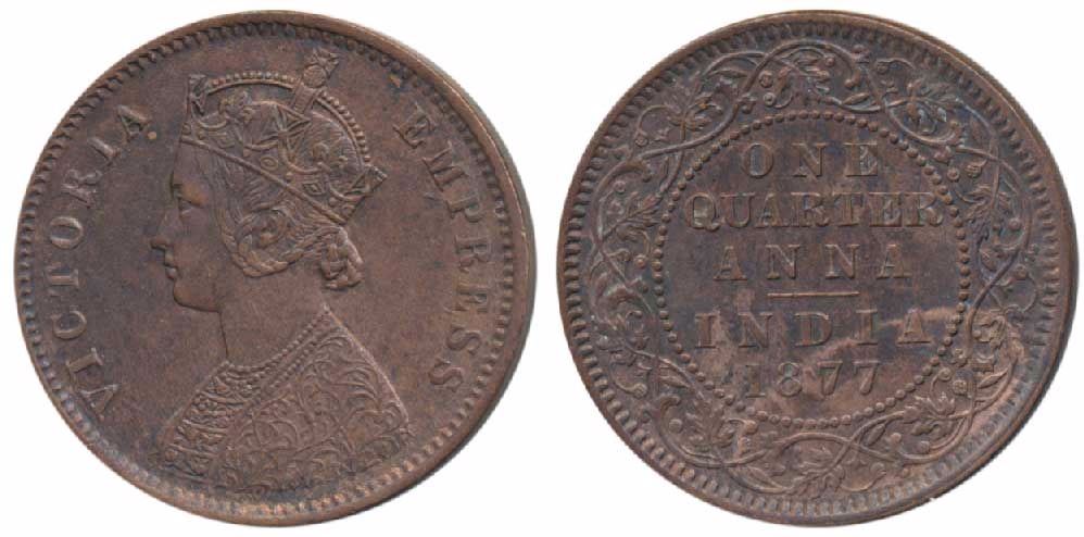 Victoria Empress, Copper ¼ Anna, 1877, Calcutta Mint, (Prid 611). Extremely Fine. Rare.