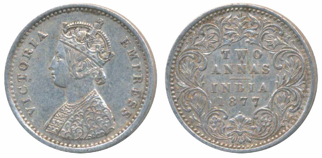 Victoria Empress, Silver 2 Annas, 1877, Bombay Mint, A / I / dot, (Prid 520). Extremely Fine.