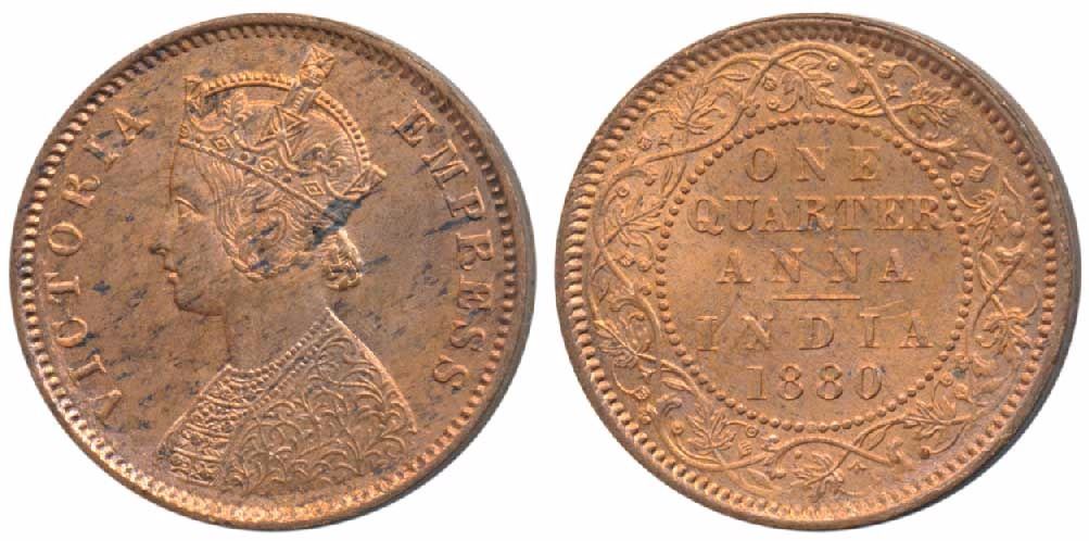 Victoria Empress, Copper ¼ Anna, 1880, Calcutta Mint, C below date on centre bead, (Prid 614). Uncirculated, Rare.