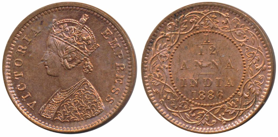 Victoria Empress, Copper 1/12 Anna, 1886, Bombay Mint, obv. A, (Prid 813). Brilliant Uncirculated.