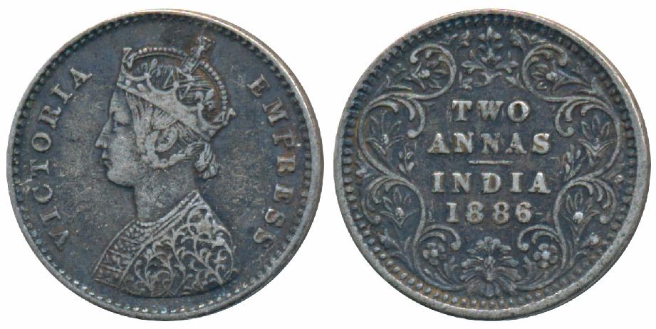 Victoria Empress, Silver 2 Annas, 1886, Bombay Mint, A / II / B incuse, Unlisted in Pridmore. GK 780, Very Fine+, Extremely Rare.