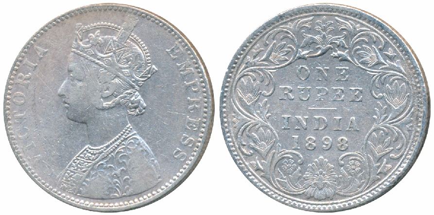 Victoria Empress, Silver Rupee, 1898, Bombay Mint, C2 / I / B incuse, 8 over 4 in date, old reverse dies of 1894 were used to struck coins of 1898 by re-dating the last numeral, Unlisted in Pridmore. About Very Fine, Rare.