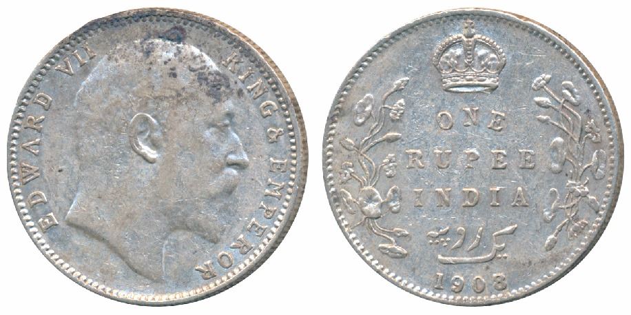 Edward VII, Silver Rupee, 1908, Bombay Mint, B incuse with dot on the vine and 8 over 7 in date, old reverse dies of 1907 were used to strike coins of 1908 by re-dating the last numeral, Unlisted in Pridmore. Very Fine+, Rare.