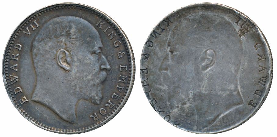 Edward VII, Silver Rupee, Error, Brockage, nice complete lakhi impression on rev., the lakhi impression of the portrait has expanded on the rev. About Extremely Fine, Rare.