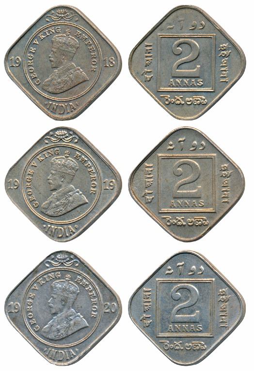 George V, Cupro-Nickel 2 Annas, 1918, Calcutta Mint, (Prid 880); 1919, Calcutta Mint, (Prid 881); 1920, Calcutta Mint, (Prid 882). The first two Uncirculated, the last Extremely Fine. (3)