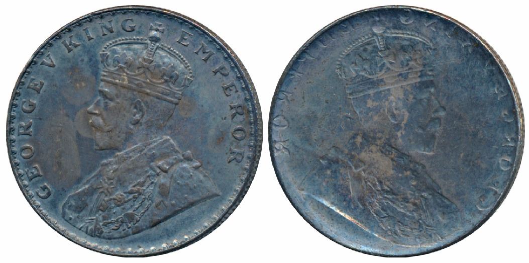 George V, Silver Rupee, Error, Brockage, nice deep and complete lakhi impression on rev., the lakhi impression of the portrait has expanded on the rev. Nice grey toning, About Uncirculated, Rare.