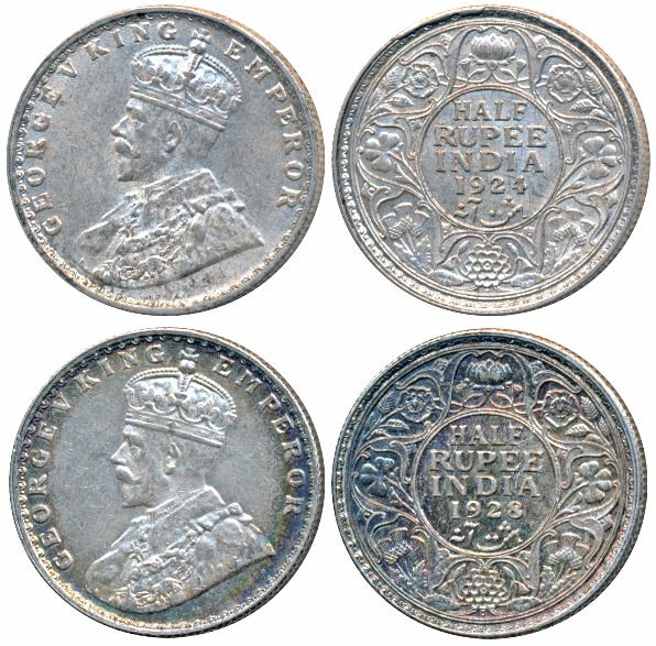 George V, Silver ½ Rupee (2), 1924 and 1928, Bombay Mint, (Prid 346 & 349). About Uncirculated and Uncirculated. (2)