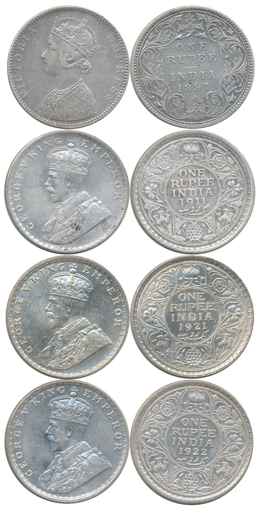 Silver Set of (56), Silver Rupees (55), Willam IV, 1835, Victoria Queen, 1840 (CL), 1840 (DL), 1862, 1874, 1875, 1876, Victoria Empress, 1877, 1878, 1879, 1880, 1881, 1882, 1883, 1884, 1885, 1886, 1887, 1888, 1889, 1890, 1891, 1892, 1893, 1897, 1898, 1900, 1901, Edward VII, 1903, 1904, 1905, 1906, 1907, 1908, 1909, 1910, George V, 1911, 1912, 1913, 1914, 1915, 1916, 1917, 1918, 1919, 1920, 1921, 1922, George V, 1938, 1940, 1941, 1942, 1943, 1944, 1945, George VI, Nickel (1), 1947. Extremely fine to about uncirculated. 56 coins.