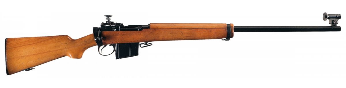 This is an example of a WWII No4 MK British Enfield rifle that was converted in the 1950/1960s to a commercial target rifle in 7.62mm NATO. The rifle has a target globe front sight and a J. Parker model 8/53 target rear sight. Import marking on the barrel. The left side of the receiver is marked "7.62M/M L39 A1/UE.70.A763." Smooth pistol grip stock stamped "CR512" and "CF/1" in the grip area and a serrated rubber buttplate.