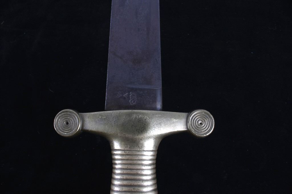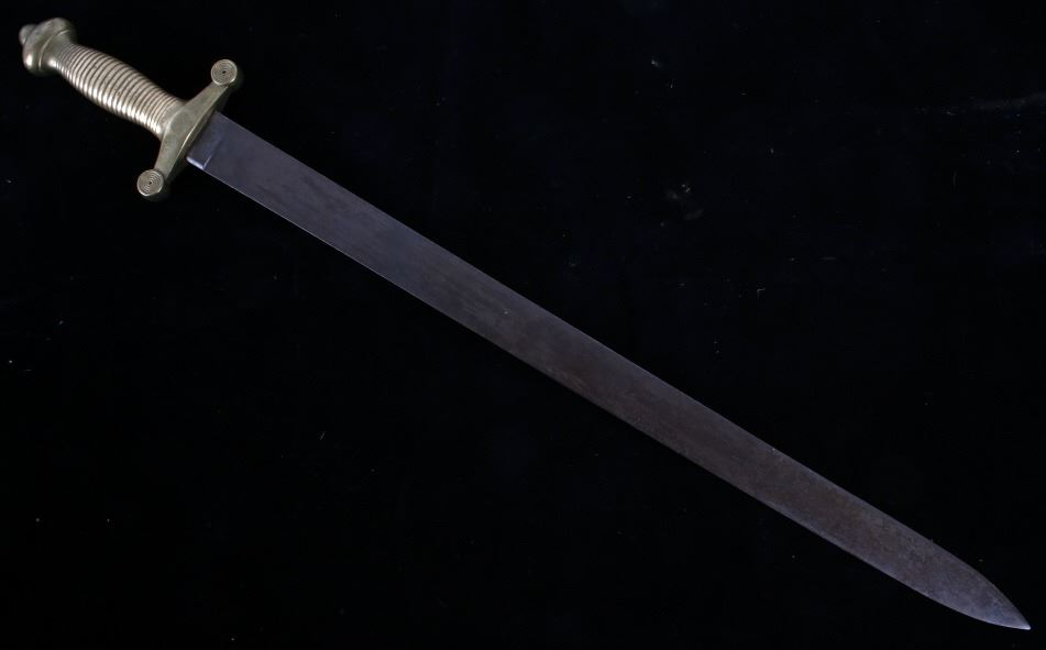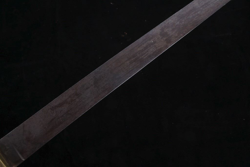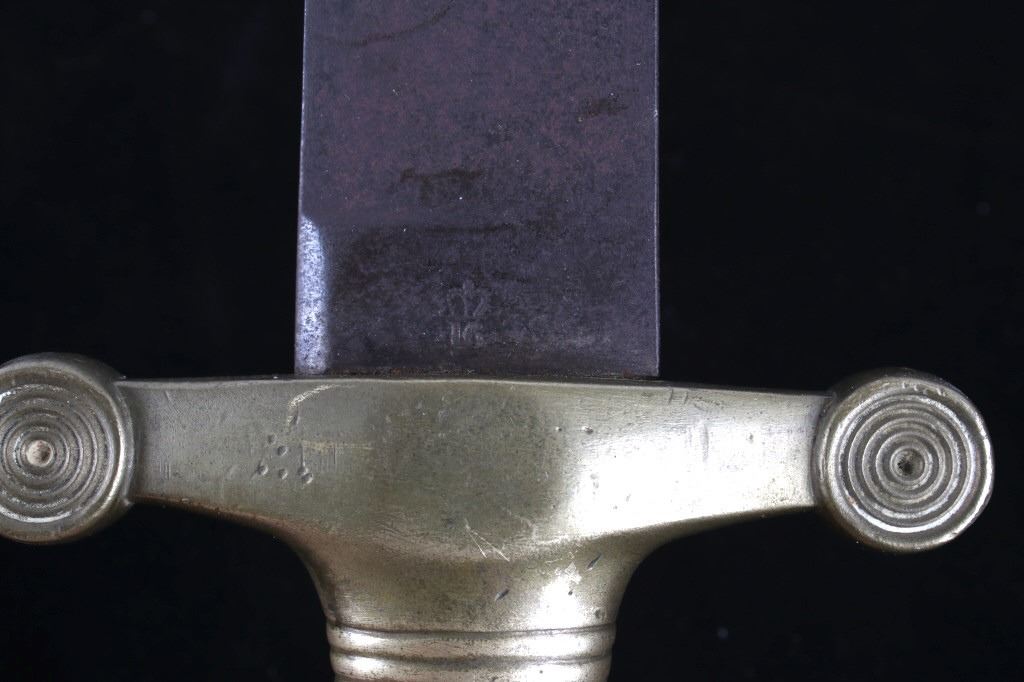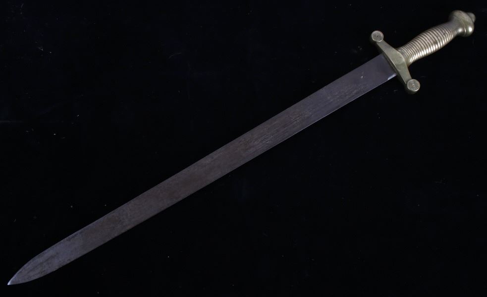 Featured in this lot is a British 1855 pattern short sword from the Land Transport Corps. The sword displays a 22 1/2" long single-edged blade with a solid brass grip and guard. The blade features a single cutting edge and retains various British proof marks at the base of the blade. The handle shows solid brass construction with the handle, pommel, and guard one single piece. The piece shows good condition overall, with a warm patina across the blade and handle and some light wear. The piece measures 28 1/4" long with a 22 1/2" long blade.