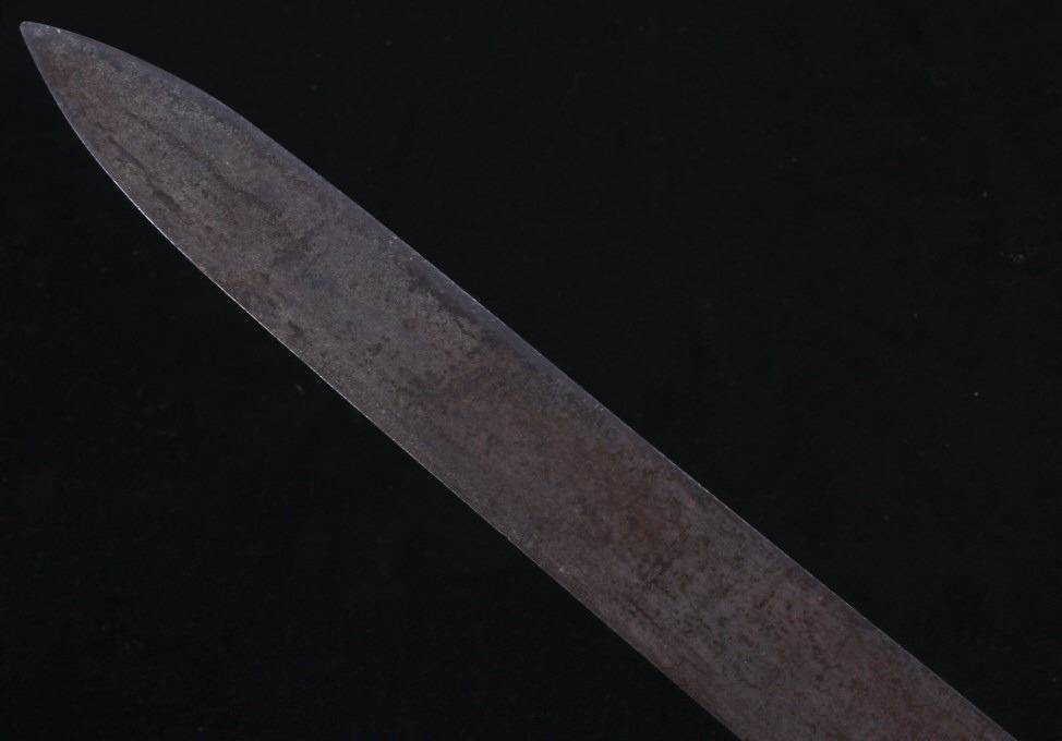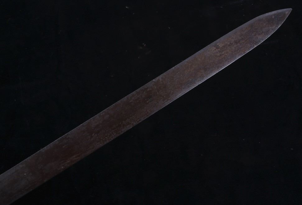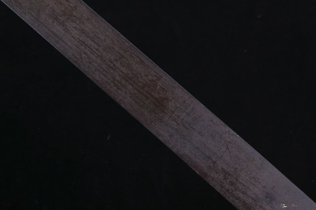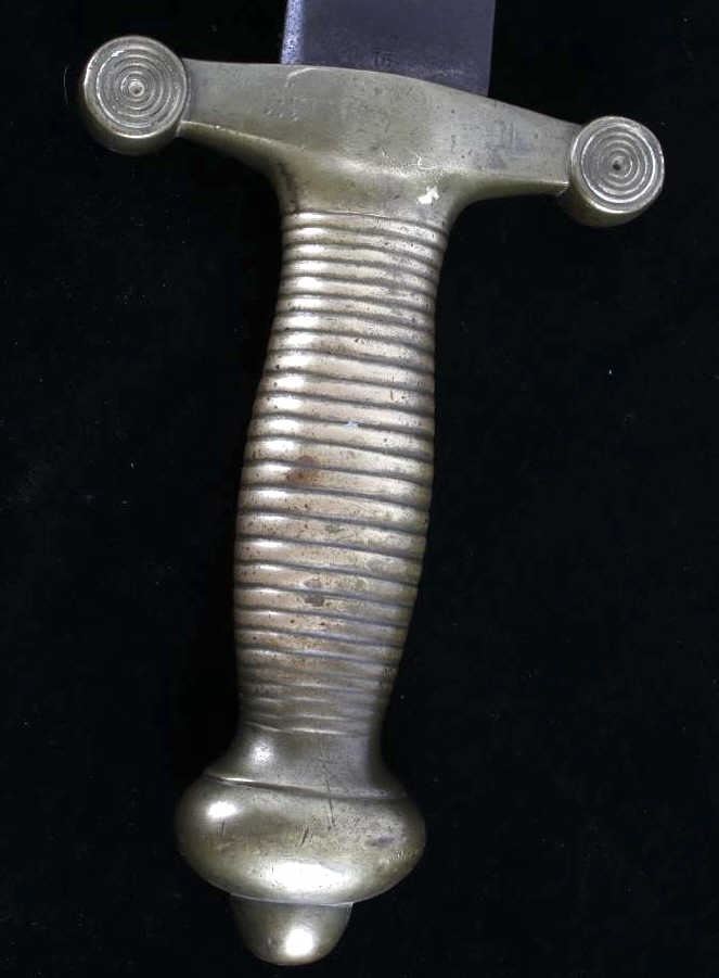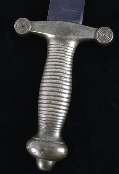 Featured in this lot is a British 1855 pattern short sword from the Land Transport Corps. The sword displays a 22 1/2" long single-edged blade with a solid brass grip and guard. The blade features a single cutting edge and retains various British proof marks at the base of the blade. The handle shows solid brass construction with the handle, pommel, and guard one single piece. The piece shows good condition overall, with a warm patina across the blade and handle and some light wear. The piece measures 28 1/4" long with a 22 1/2" long blade.