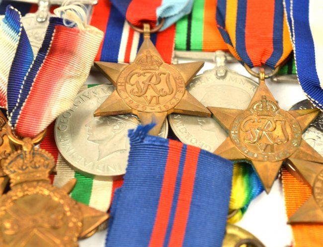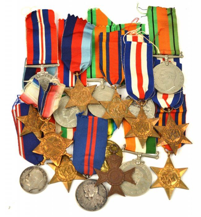 An assortment of 20th century British campaign medals including: Six WWI silver medals, some named, George V silver Good Conduct medal, named. The rest are mostly base metal stars and award medals from WWI and WWII. The silver medals are generally very fine, the others fine or better. Much duplication. 19 items total.