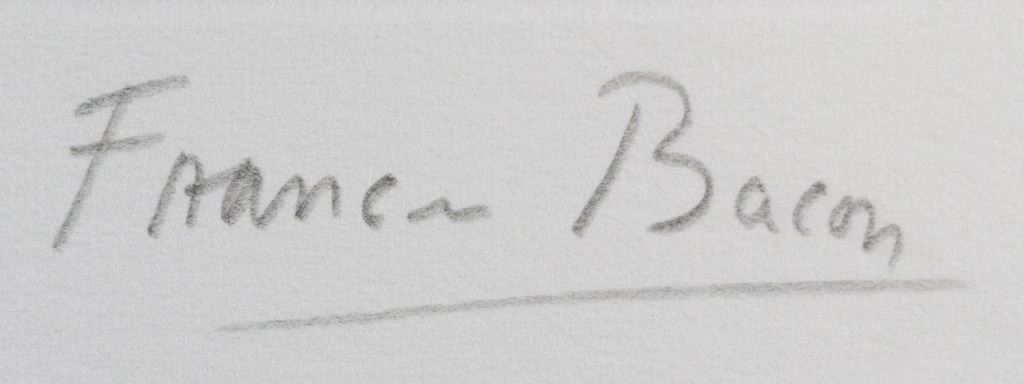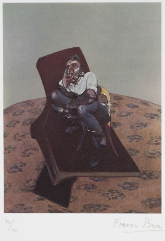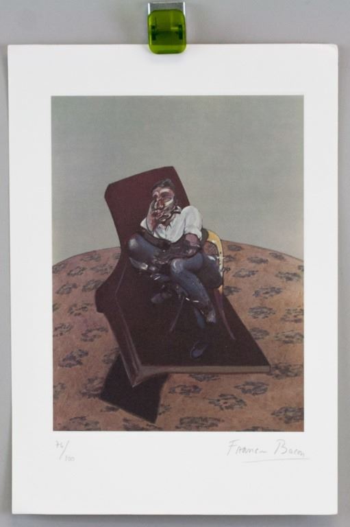 Linocut on paper. Featuring surrealist composition of a man against a chair-like object. Signed "Francis Bacon" to the bottom right. "76/100" inscribed to the bottom left. Image size: 21.5 x 16 cm (8.5 x 6.3 inches). Sheet size: 30 x 21 cm (11.8 x 8.3 inches).