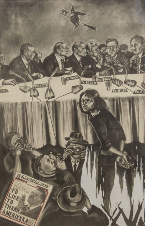 Lithograph on paper. Featuring Anita Hill's being burnt in front of a panel of American senators. Newspaper to the bottom left reads "I'D LIKE TO THANK AMERIKKKA". Original titled "Thank you America" (as inscribed beneath the image). "15/30" inscribed to the bottom left. Signed "Sue Coe" to the bottom right, with "91" inscribed beside the signature. Lithograph printed on embossed paper. 76.2 x 48.3 cm (30 x 19 inches).