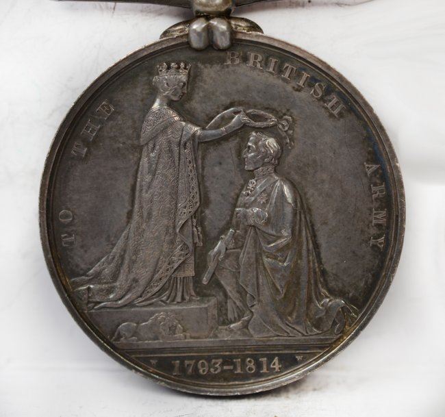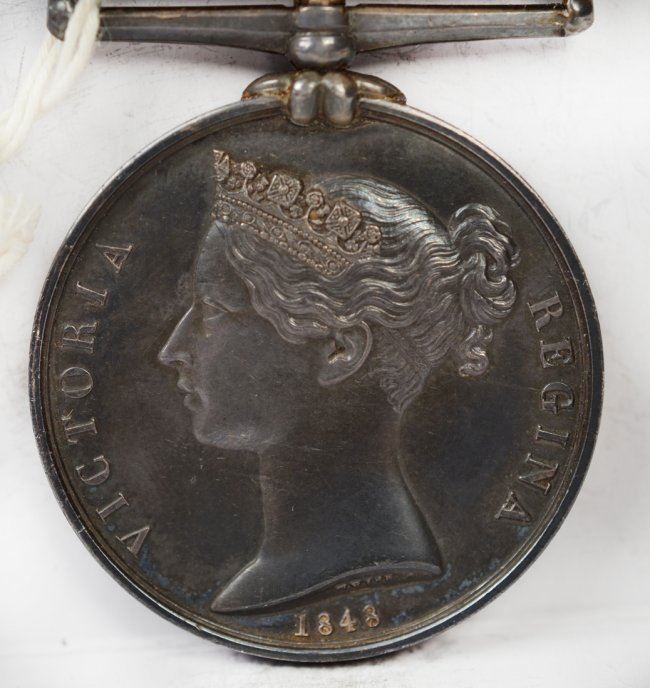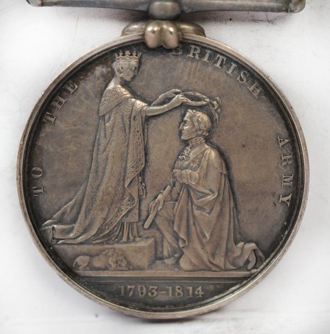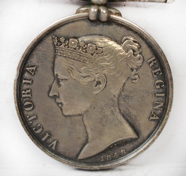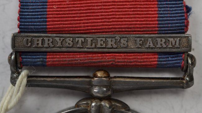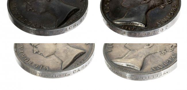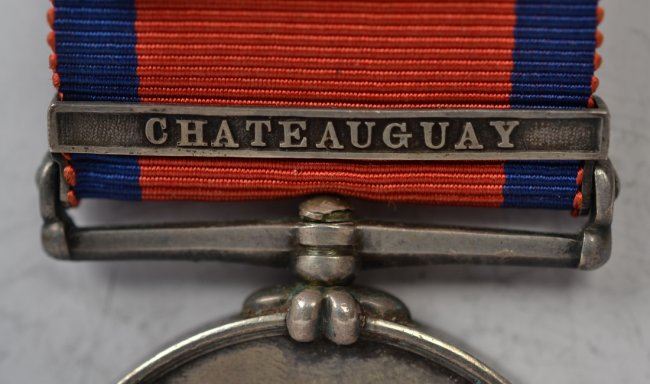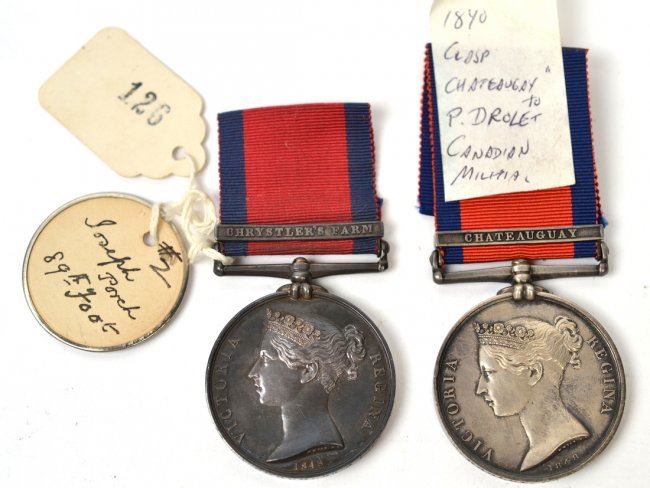 A pair of interesting Victoria Military General Service medals. Young head portrait of Victoria by Wyon, reverse allegory of a young queen presenting wreath to officer. The first has single bar CHRYSTLER'S FARM. The second, with single bar CHATEAUGUAY. Both with ribbons and named on edge to Canadians. Both pleasing, very fine condition. Lovely tone, minor marks.