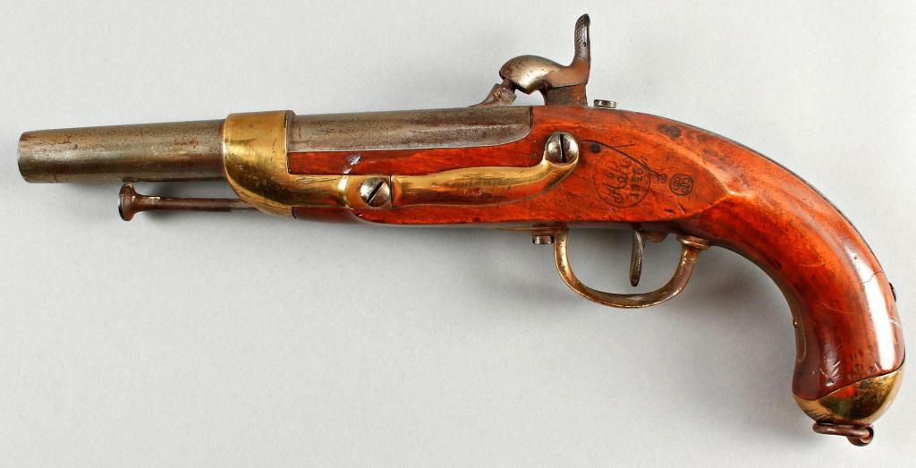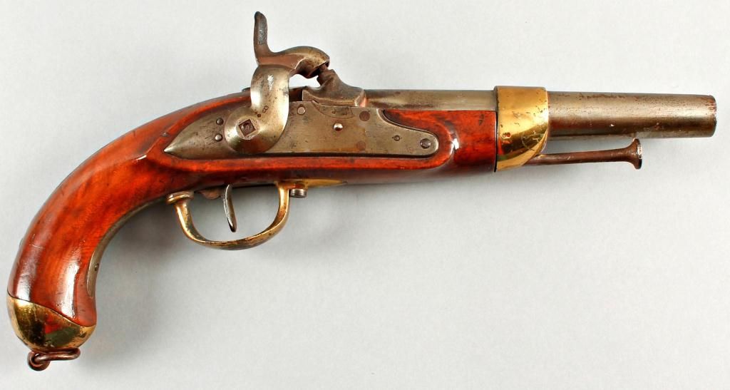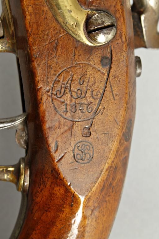 British Mdl Percussion Cal .69 SN:NVSNEarly percussion military pistol, 7.5" barrel, converted from Flintlock, 1 piece wood grip and stock, brass furniture, showing very good cartouches, dated 1846, lanyard ring on pommel, lock is not marked, goodworking action. Condition: Overall good with hairline crack in grip.