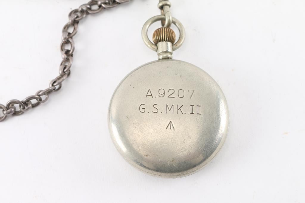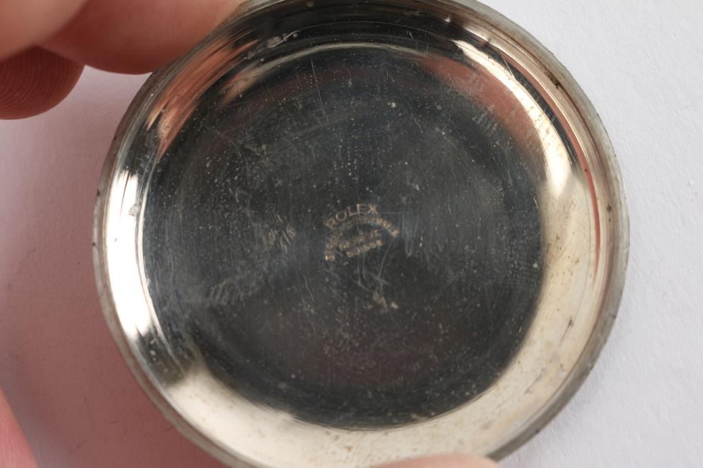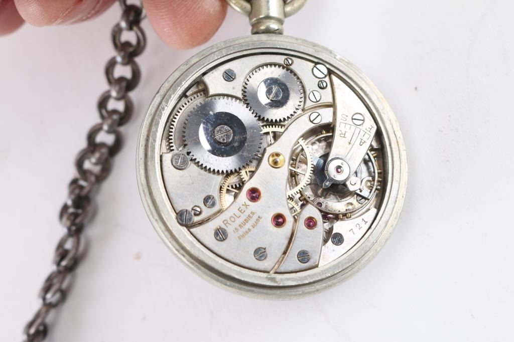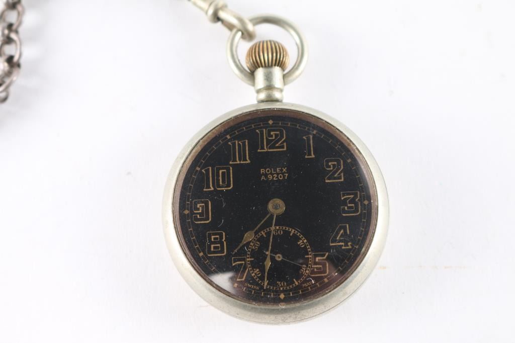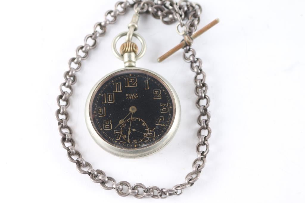 This is a genuine Rolex pocket watch evaluated by the British Army and given the grade “General Service Mark II” and was used in the Second World War. The nickel bridge movement has a lever escapement and is signed “Rolex, 15 Rubies Swiss Made, 721” and is in 80% mint condition – some scratches and marks The movement comes in a white metal open face case, which has a screw off back and bezel. The case is signed “Rolex, 31 Records, Universels, Geneve, Suisse” on the inside of the back cover. The back of the back cover is engraved “A 9207, G.S. Mk II” and with the broad arrow, British government mark. The case has a smooth plain finish and is in good condition. The black enamel dial has old luminous hands and numbers. It is signed “Rolex, A 9207”. In good working order. Comes with a period T-Bar pocket watch chain, very good condition with a nice patina.