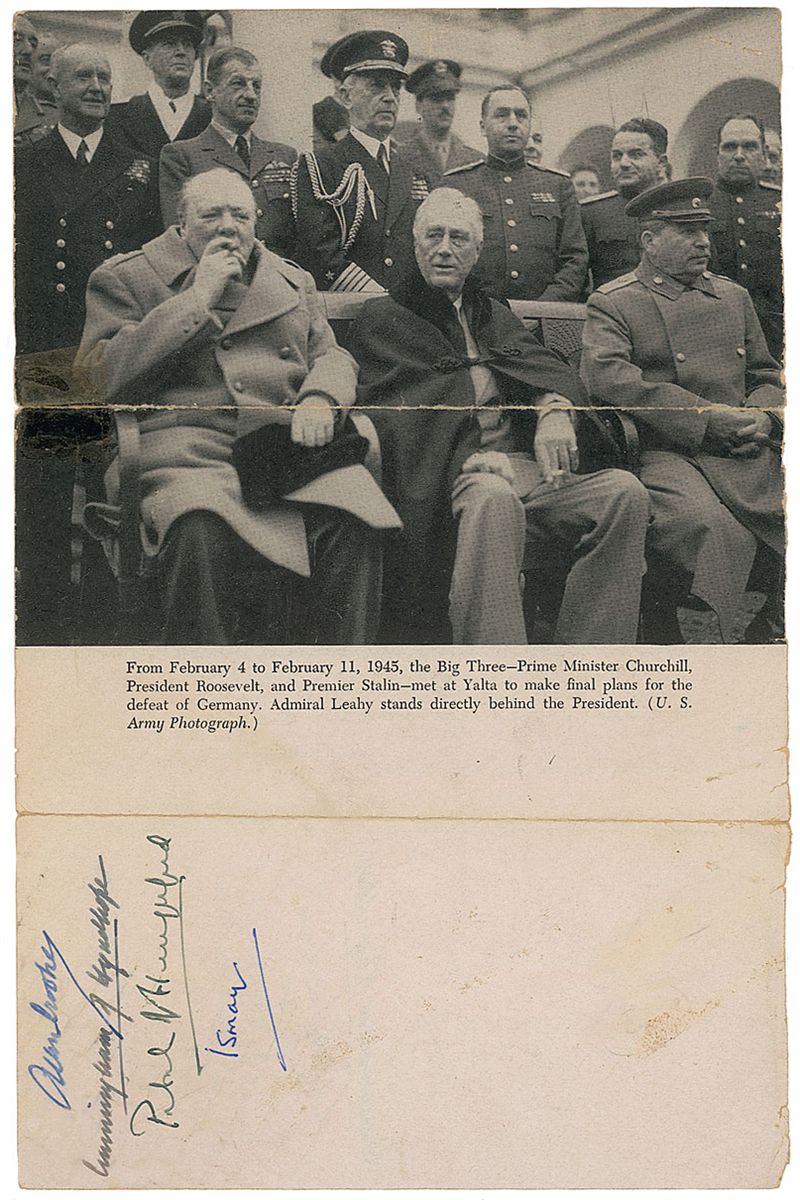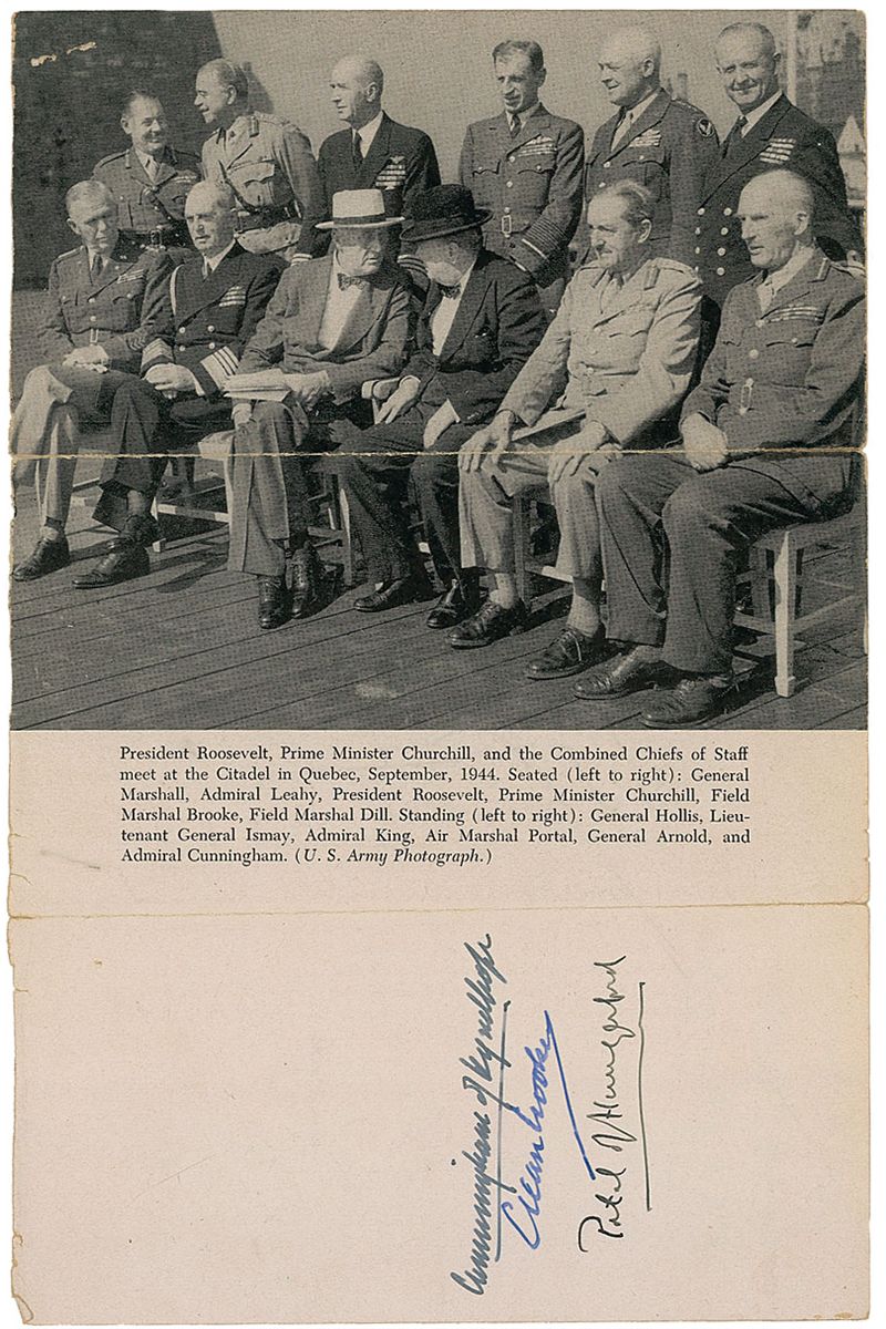 Vintage book page featuring images of national leaders during WWII, 5.75 x 9, signed vertically in ink on one side by Andrew Cunningham, Alan Brooke, Charles Portal, and Hastings Ismay, and signed again on the opposite side by Cunningham, Brooke, and Portal. Removably encapsulated in a Mylar sleeve. In very good condition, with two noticeable horizontal folds (with tape-repaired partial separations), some scattered soiling, and small staple holes and edge tears.