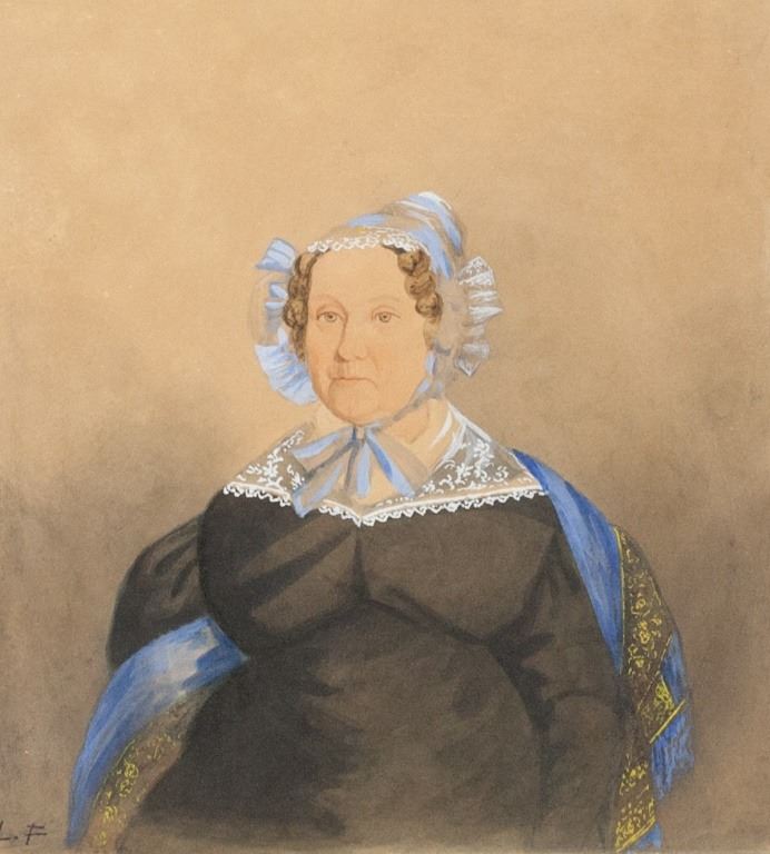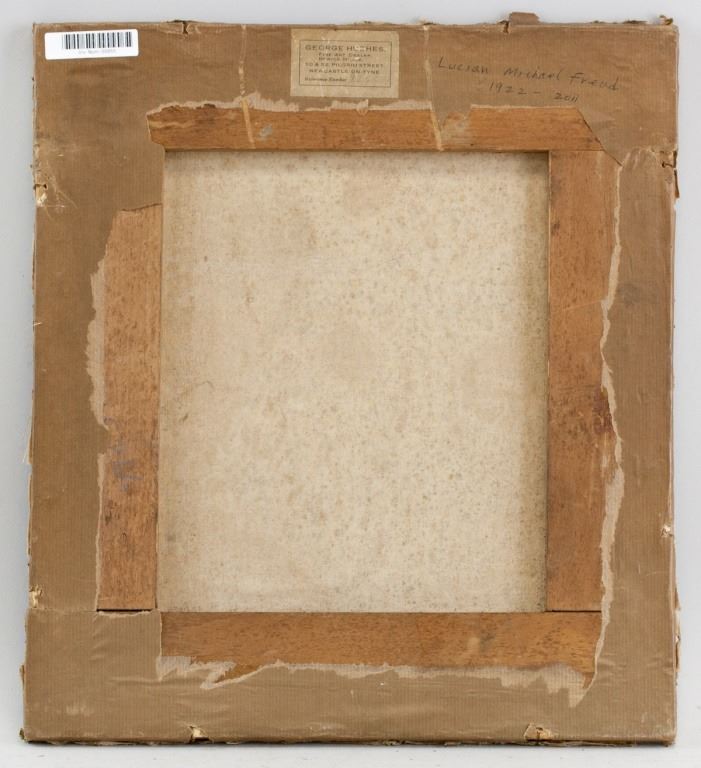 Mixed media on paper. Featuring a woman in a black dress with lace at the shoulders, wearing a blue bonnet. Signed "L.F" to the bottom left corner. "Galerie Vallauris" stamped beneath the image. "Lucian Michael Freud 1922-2011" inscribed beneath the image. Label on verso reads "GEORGE HUGHES / FINE ART DEALER". 34 x 31 cm (13.5 x 12 inch).