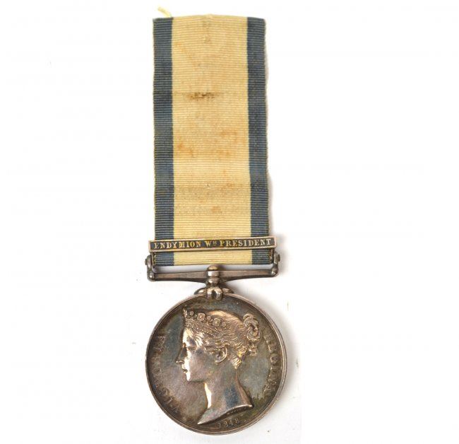 Queen Victoria Naval General Services silver medal, 1848 with ribbon and bar "Endymion Wh President" for the capture of the American frigate during the War of 1812. Named on edge. Very Fine condition, old cleaning now re-toning.