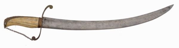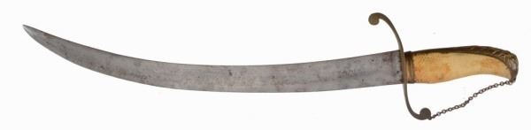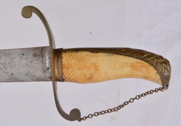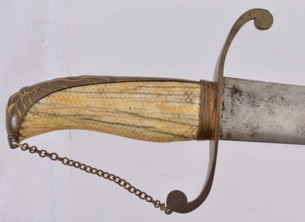 British Naval Dirk with a large curved 15.5 inch long sturdy fullered blade. The upper half of back piece of the hilt is in the form of the Lion’s mane. The pommel is in the shape of Lion’s head with gilt remaining in the recesses. The grip is of ivory with age checking but no cracks. The Dirk dates to the first two decades of the 1800’s. Commissioned Officers as well as midshipmen would wear a Dirk like this on watch.
