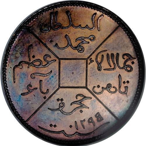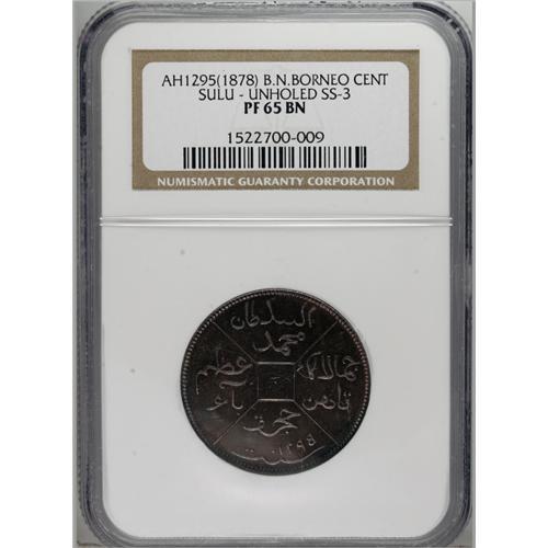 <B>British Colonial Pattern Cent 1295AH (1878), </B></I>Singh SS-3, Sweeny BN3 but without the central hole, Proof 65 Brown NGC, toned luster with fully reflective surfaces. Struck at the Birmingham Mint after a grant from the Sultan of Sulu to a large area of northeast Borneo. Very rare and fascinating coinage!<BR><BR><b>Shipping:</b> Coins & Currency (<a target="_blank" href="http://www.heritageauctions.com/common/shipping.php">view shipping information</a>)