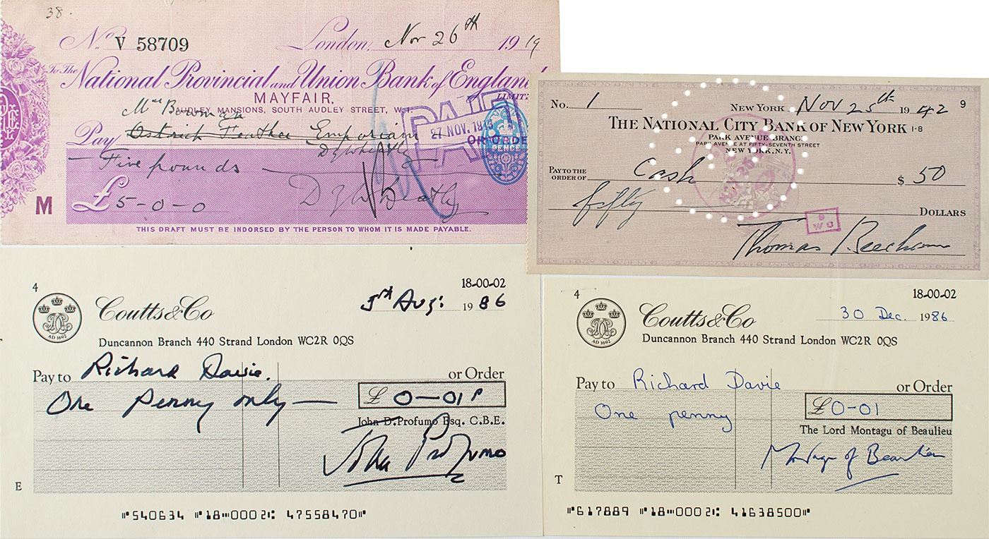 Four checks signed by British notables, dated from 1919 to 1986, including: Dennis Wheatley, John Profumo, Lord Montagu of Beaulieu, and Thomas Beachem. Accompanied by a check signed on Beachem's behalf by his second wife, Betty Humby. In fine condition.