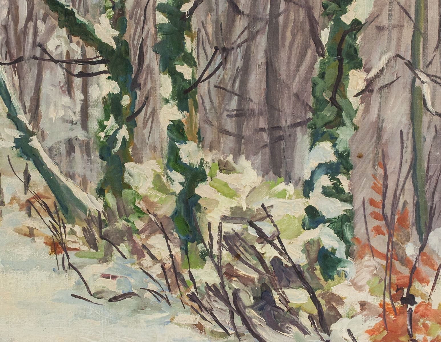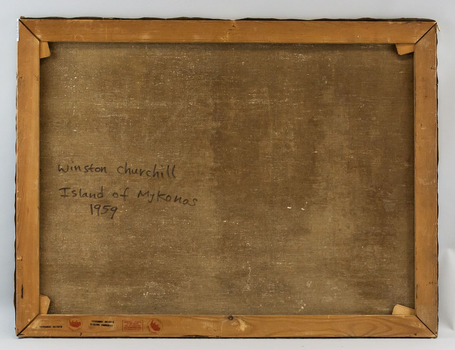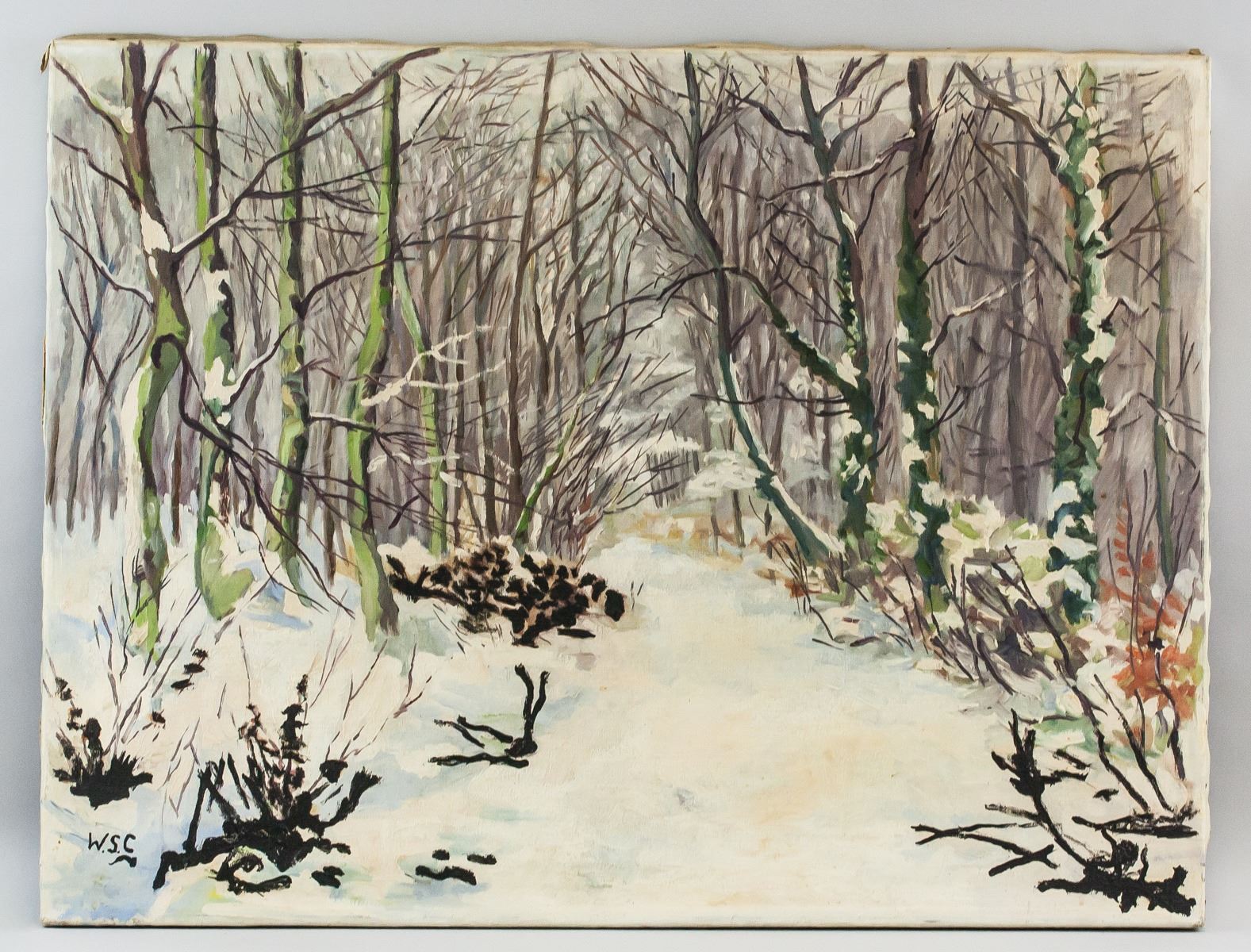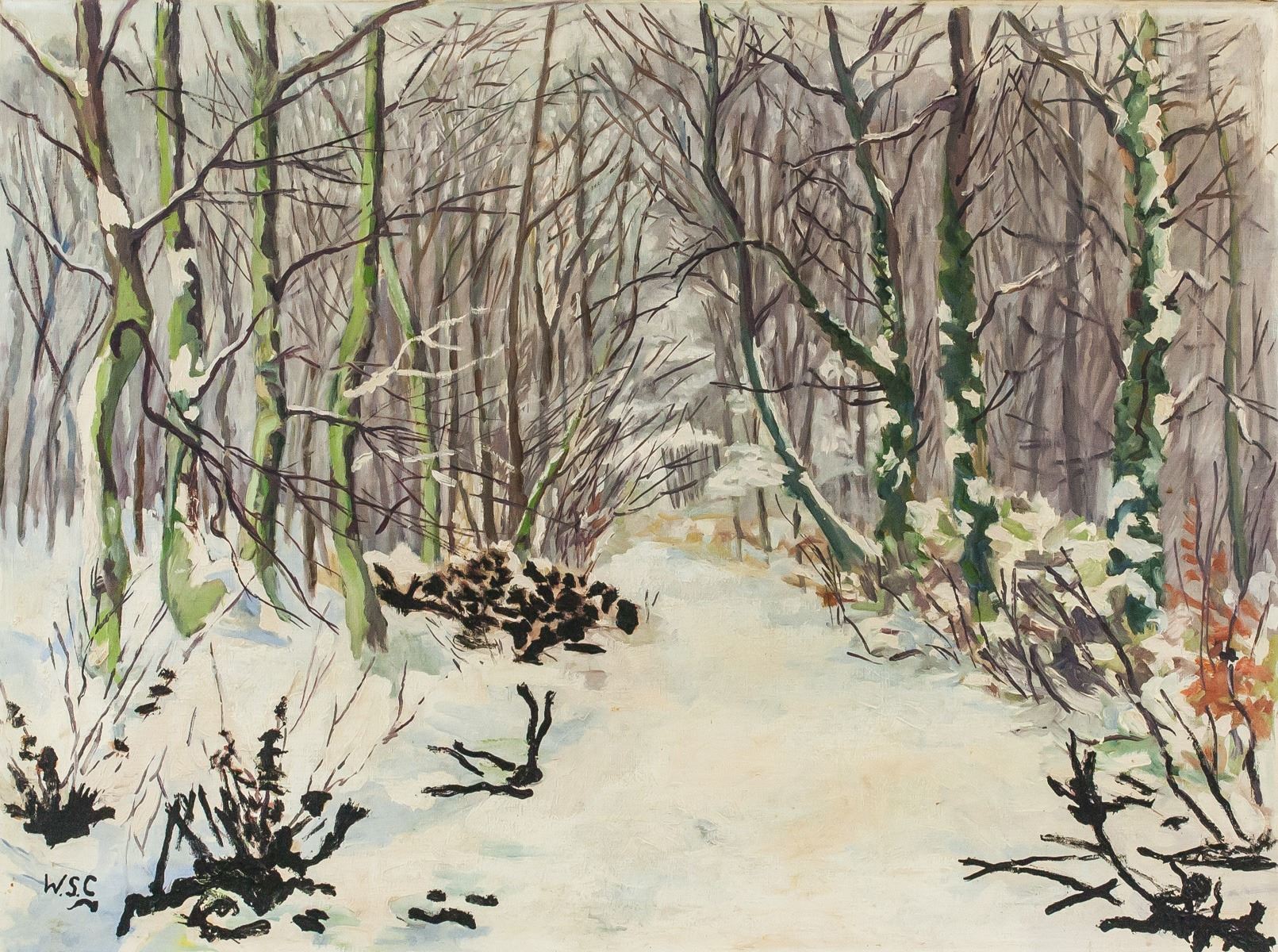 Oil on canvas. Featuring a winter forest scene. Signed WSC on the lower left corner. Inscribed Winston Churchill and inscribed Island of Mykonas 1959, verso. 62 x 82.5 cm (24.5 x 32.5 inches). Provenance: This lot carries limited provenance from an English estate