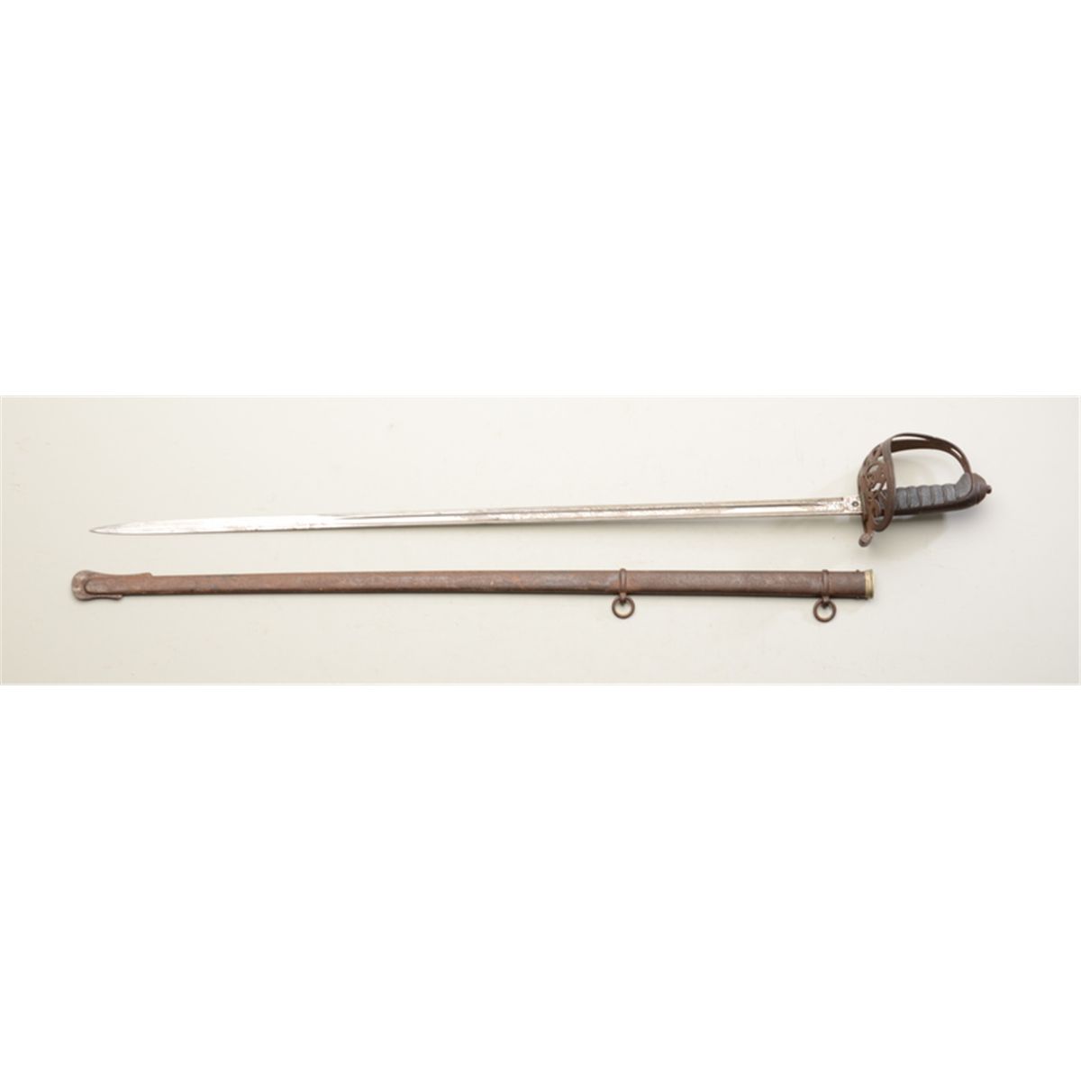 British Officer's sword with pierced iron guard showing crown and infantry bugle. Blade nicely etched and signed Watson & Co., Bombay. Late 19th to early 20th century. Blade near fine, scabbard and hilt darkenedfrom rusting, grip good. Est.: $200 - $400