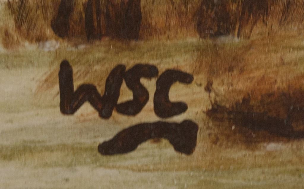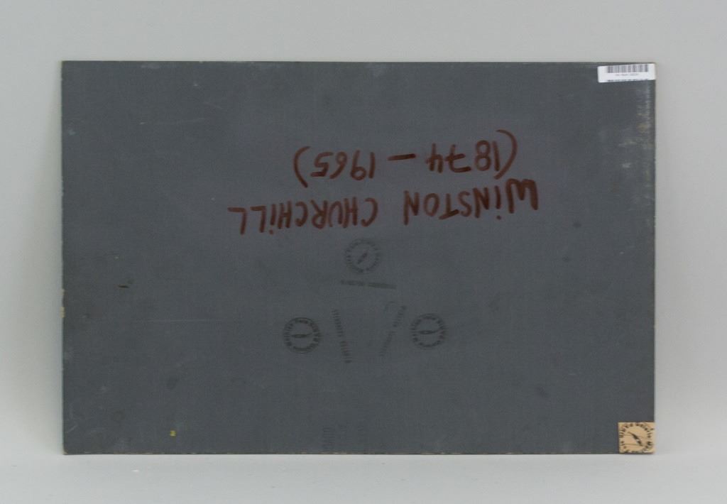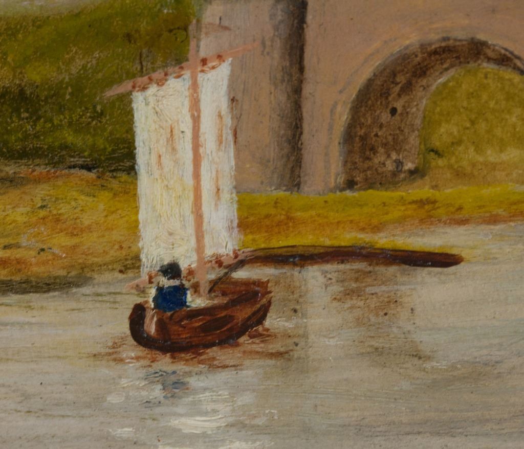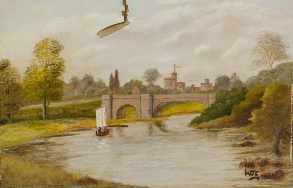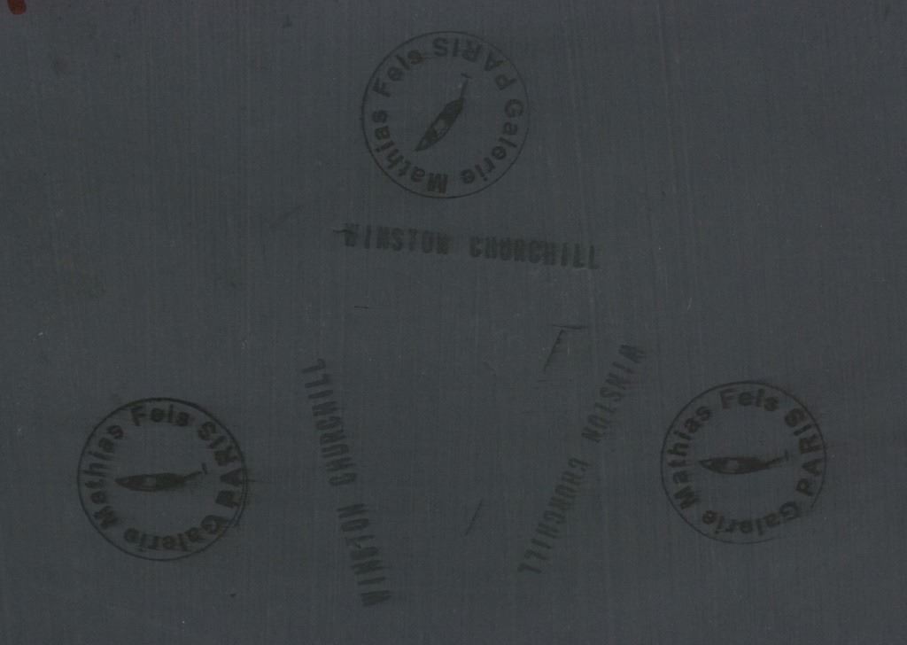 Oil on board. Featuring landscape scene with a river and bridge. A sail boat floats down the river. Signed "WSC" to the bottom right. Damaged. "Winston Churchill (1874-1965)" inscribed on verso. "WINSTON CHURCHILL" and "Galarie Mathias Fels PARIS" stamped on verso. 31 x 47 cm, (12 x 18.5s inches).
