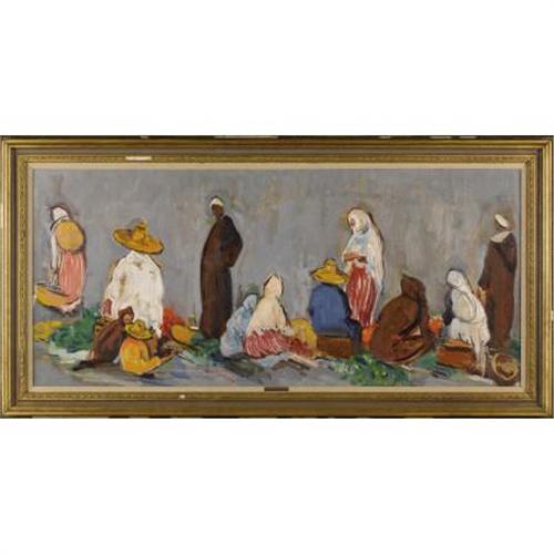 <B>PHILIP NAVIASKY</B></I> (British 1894-1983)<BR><I>Untitled (Group of Mexican Villagers)</B></I>, 20th Century<BR>Oil on panel<BR>23-1/4 x 52-1/2 inches (58.9 x 133.4 cm)<BR>Unsigned <BR>Provenance:<BR>Crow Art Partnership Collection, Dallas<BR><BR>Exhibition:<BR>Verandah Club, Hilton Anatole Hotel, Dallas<BR><BR>Philip Naviasky was born in Leeds, England, the son of Polish immigrants. Accepted to the Royal Academy at the age of eighteen, he went on to study at The Royal College of Art after receiving a Royal Exhibition Award from the Board of Education. He traveled the world producing works of art and exhibiting widely.<BR><B>Condition Report:</B> Normal signs of wear as appropriate with age. Some losses to the frame.<BR><BR><b>Shipping:</b> Requires 3rd Party Shipping (<a target="_blank" href="http://www.heritageauctions.com/common/shipping.php">view shipping information</a>)