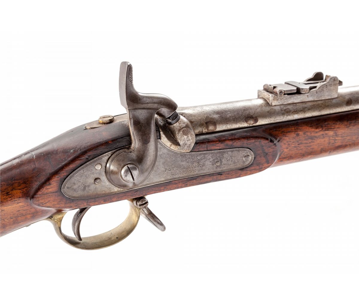 British P-1853 Enfield Three-Band Percussion Musket, by Potts & Hunt, London, NVSN, .58 cal., 39'' bright barrel, ''(crown)/CP'' and ''(crown)/V'' proofmarks, brass buttplate, triggerguard, and lockplate escutcheons; English walnut stock. It is interesting to note that the Enfield Pattern 1853 rifled musket was the second most widely used Infantry weapon of the Civil War, surpassed only by the Springfield Model 1861 rifled musket. The Confederates imported more Enfields during the war than any other small arm and saw service in every major engagement from the Battle of Shiloh, to the final battles of 1865. Condition is very good with mild general patination to bright surfaces. Stock with scuffs, scratches, pressure dings, and pinned fracture between lockplate screws on left side. Nipple appears to be a later replacement. Ramrod is present, with small loss to stock at ramrod channel. Action and bore are good. Est.: $1,500-$2,000. (Antique)