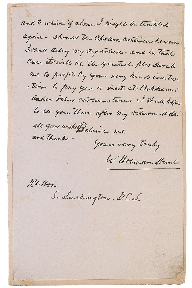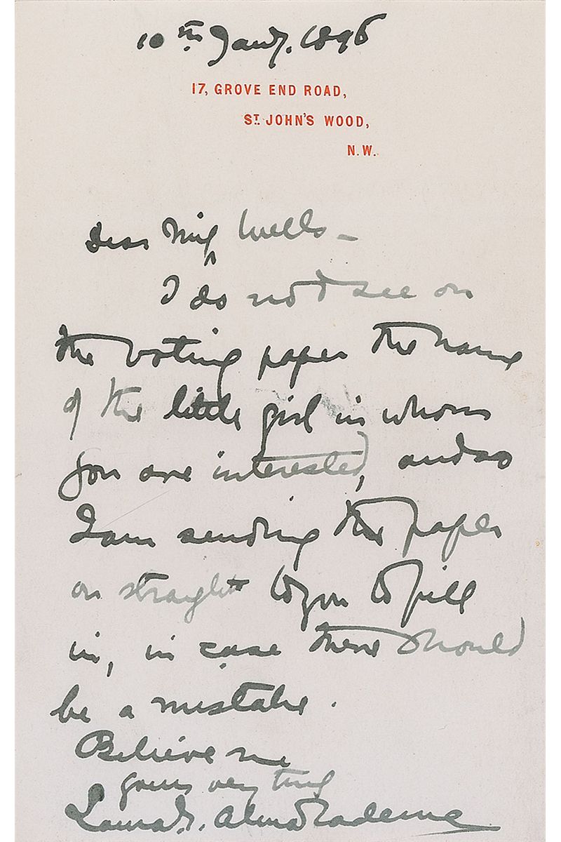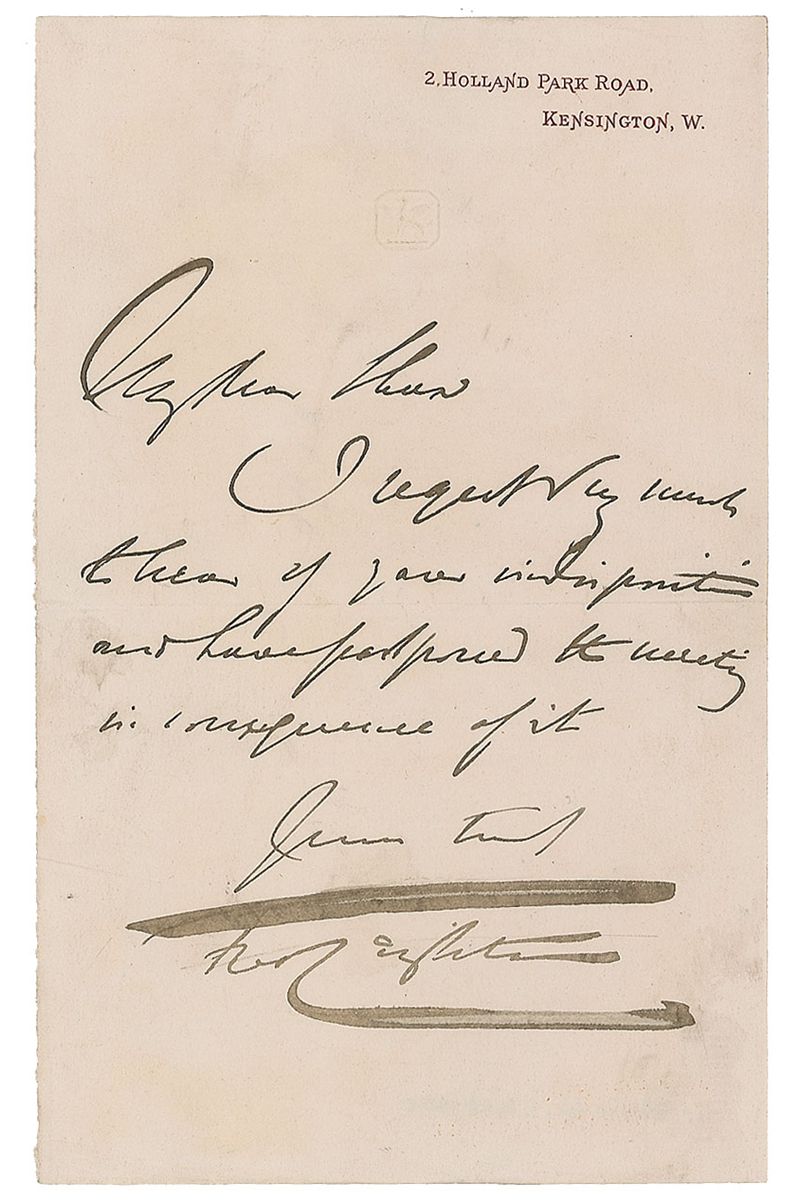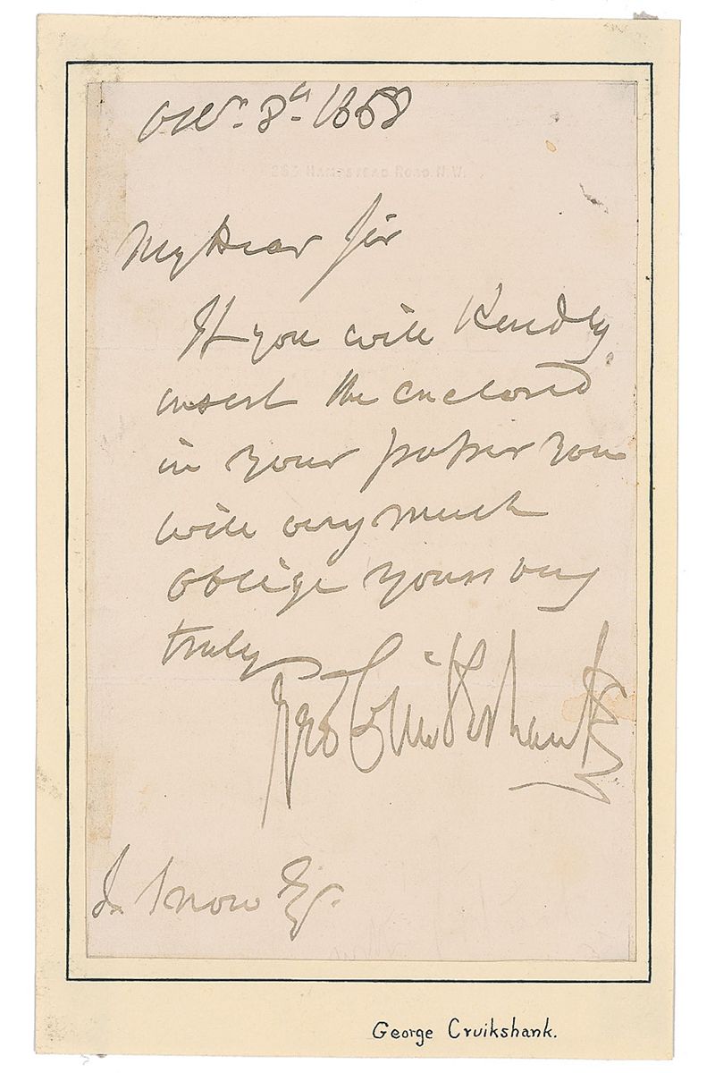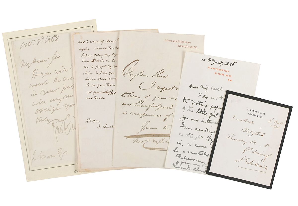 Five ALSs from prominent 19th century British painters, each one page, various sizes, dated between 1868 and 1896. Signers are: Lawrence Alma-Tadema, Willam Holman Hunt (final page of a longer letter), John Everett Millais, Frederic Leighton, and George Cruikshank. Hunt, in part: “Should the cholera continue however I shall delay my departure.” Alma-Tadema, in part: “I do not see on the voting paper the name of the little girl in whom you are interested, and so I am sending the paper on straight to you to fill in.” In overall fine condition, with various light toning and soiling.