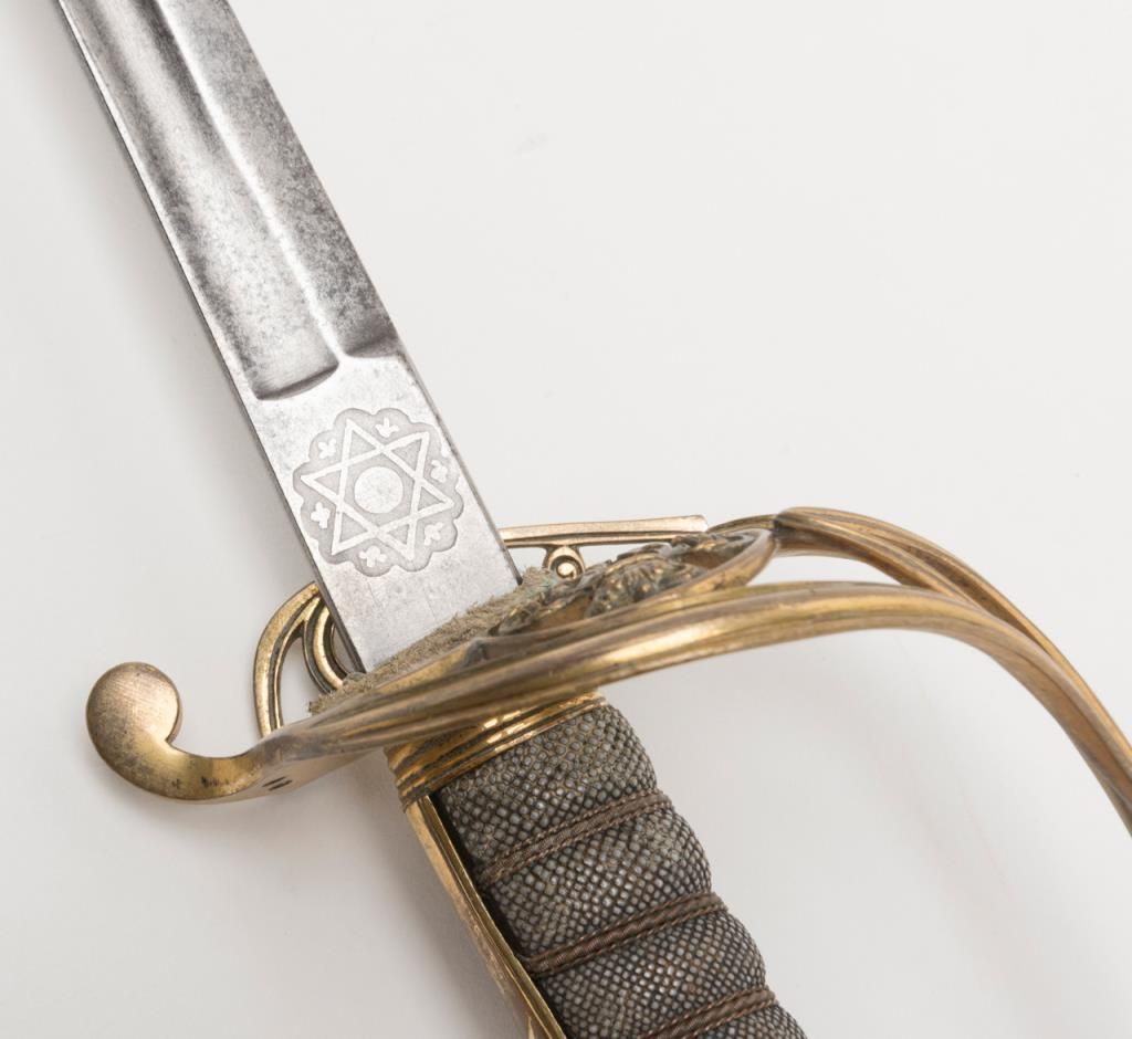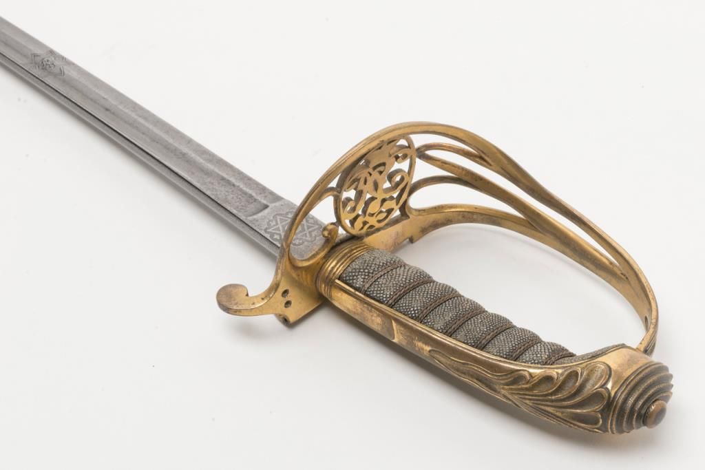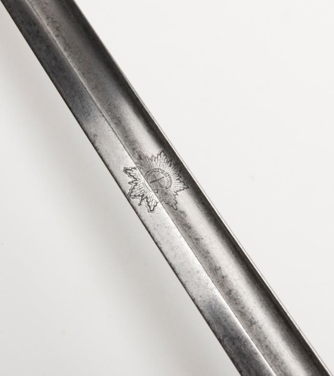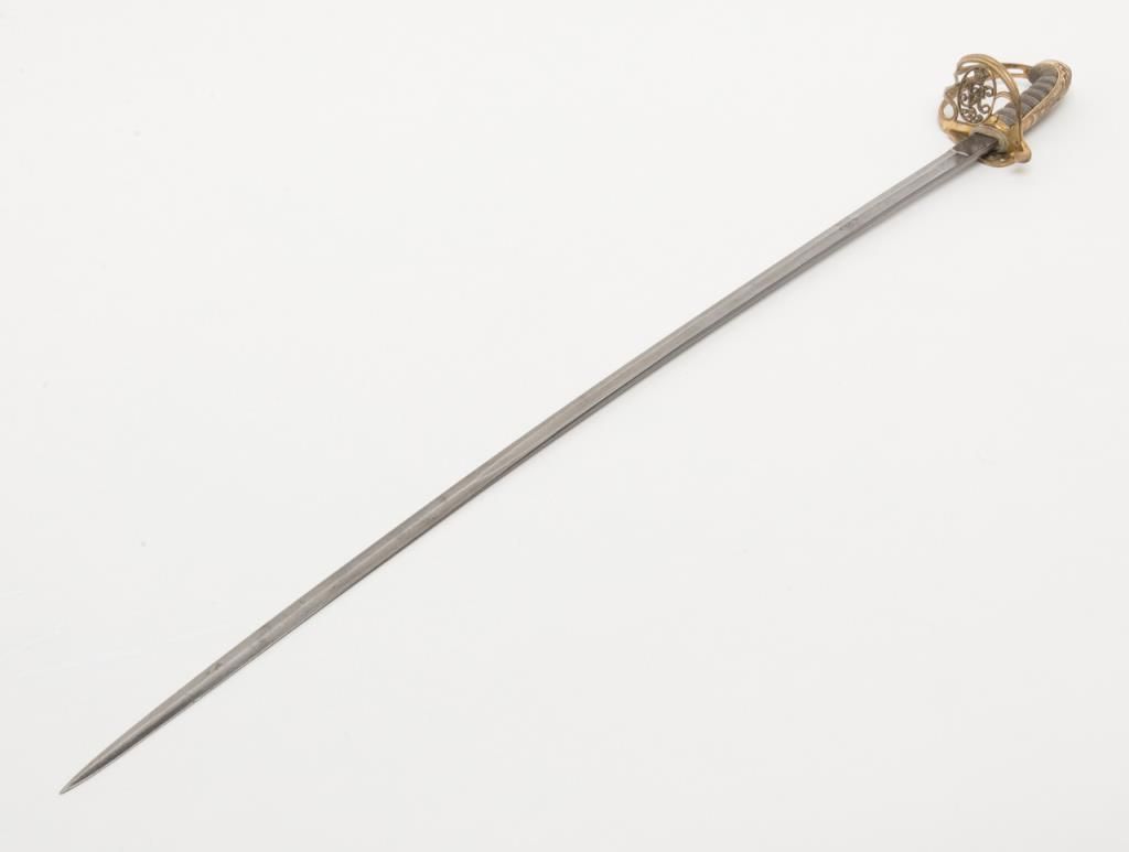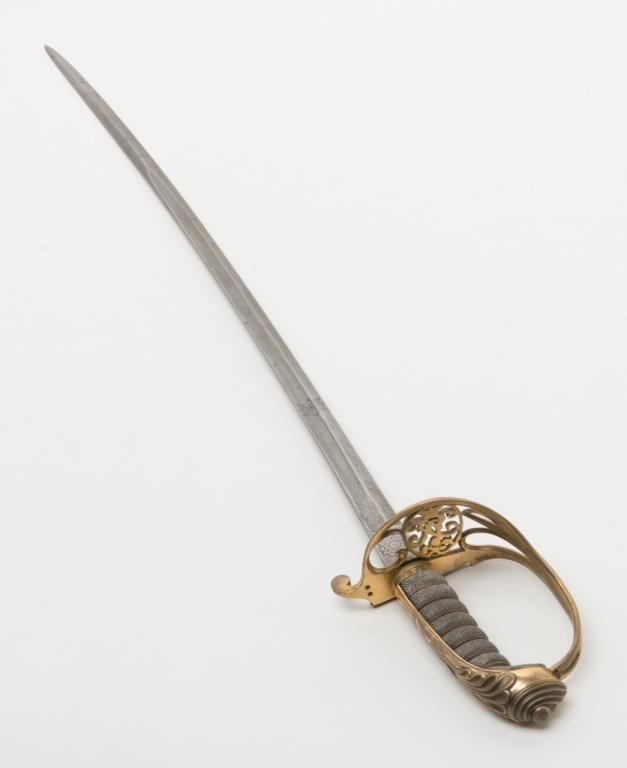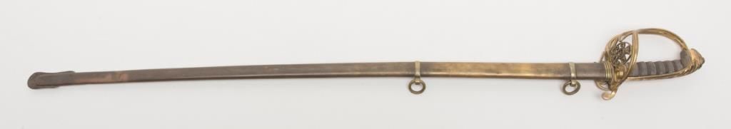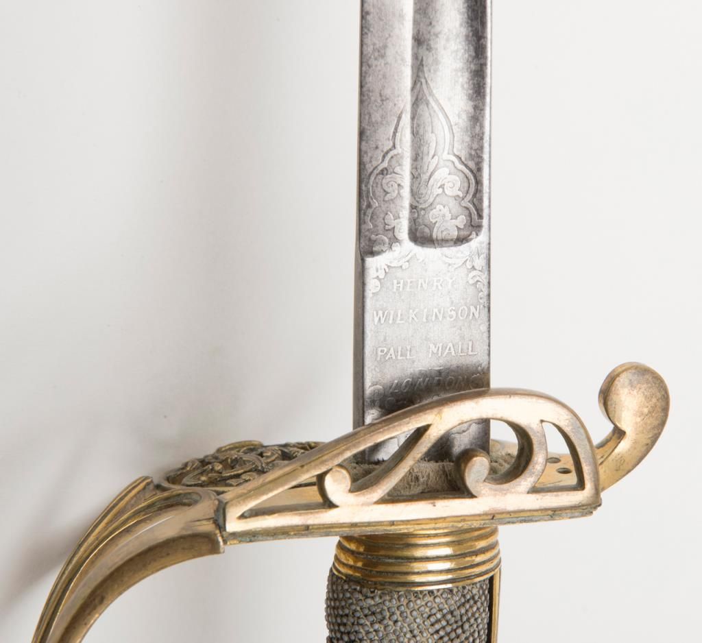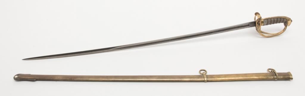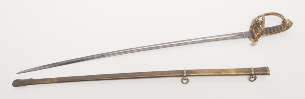British Pattern 1845 Victorian First Officer’s saber Dress Sword and brass scabbard by maker Henry Wilkinson, Pall Mall, London, in overall very good condition showing some denting to scabbard and slight surface rust; blade is etchedwith Garter, Star and initials D.R. W. and dated 1850; per consignor, initials are for Lieut. David Robertson Williamson of the Coldstream Guards who purchased the sword in 1848; later a Lt. Col. Of the Perthshire Rilfe Voluteers. Est.:$750-$1,500.