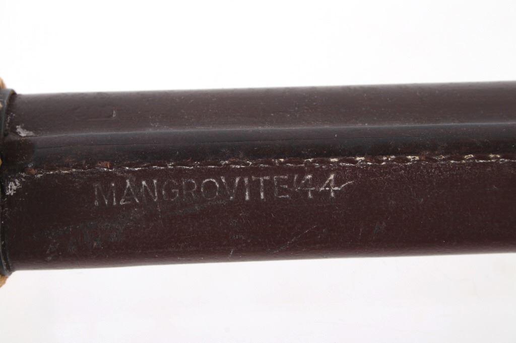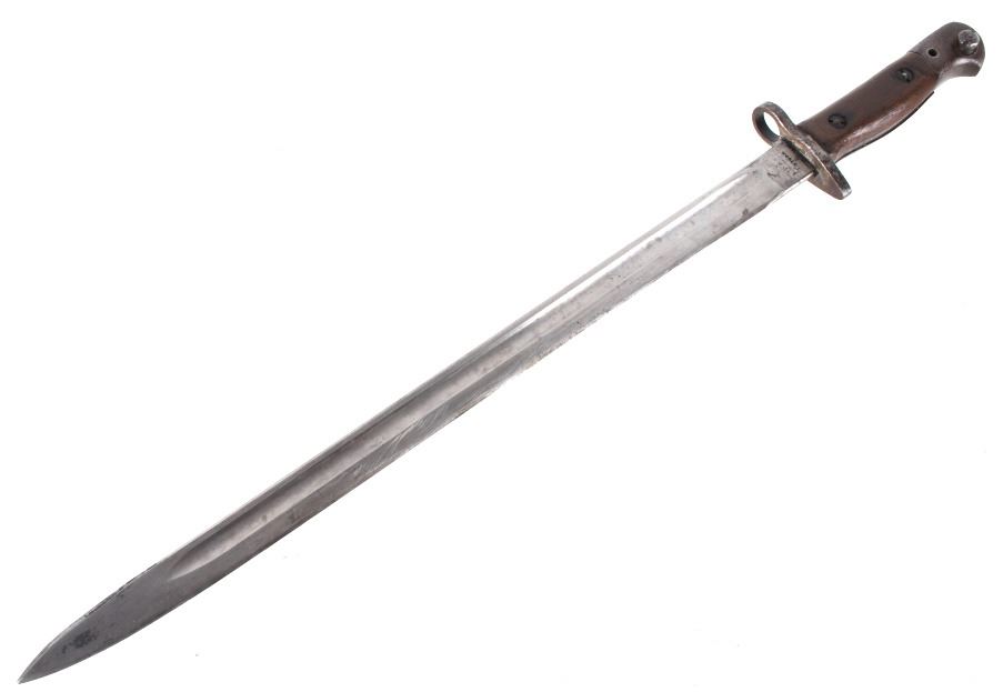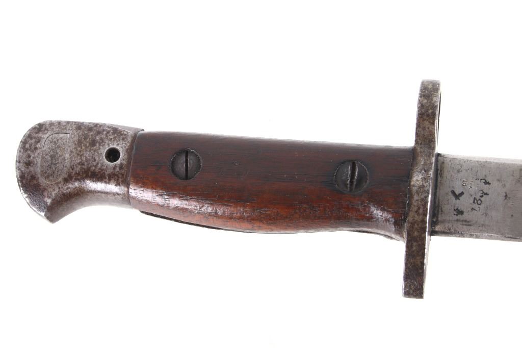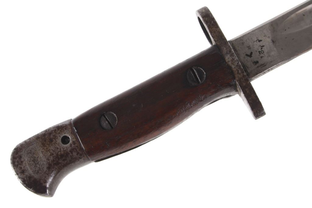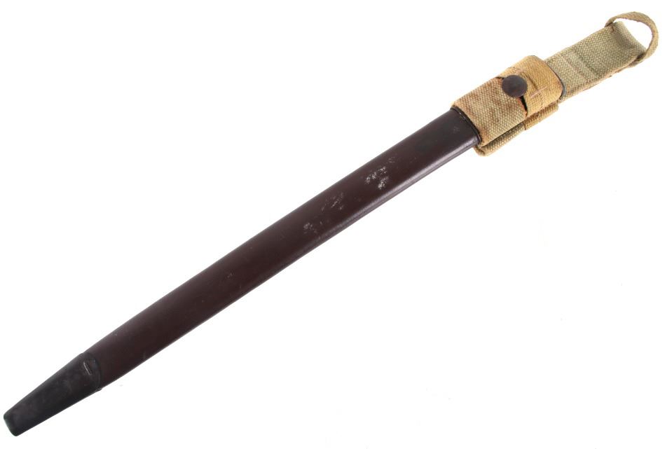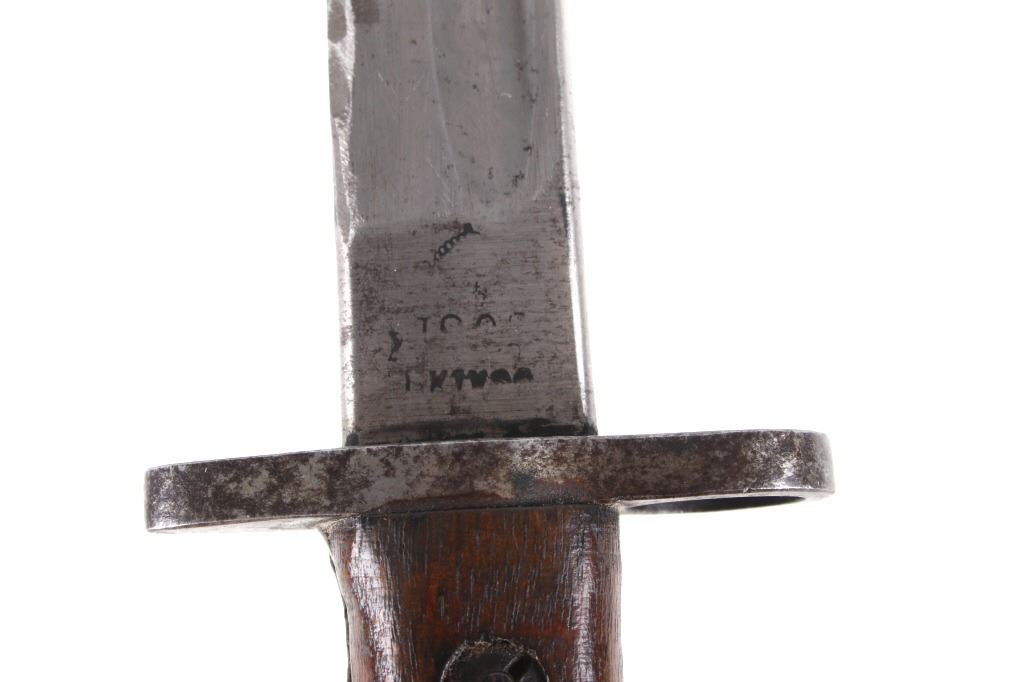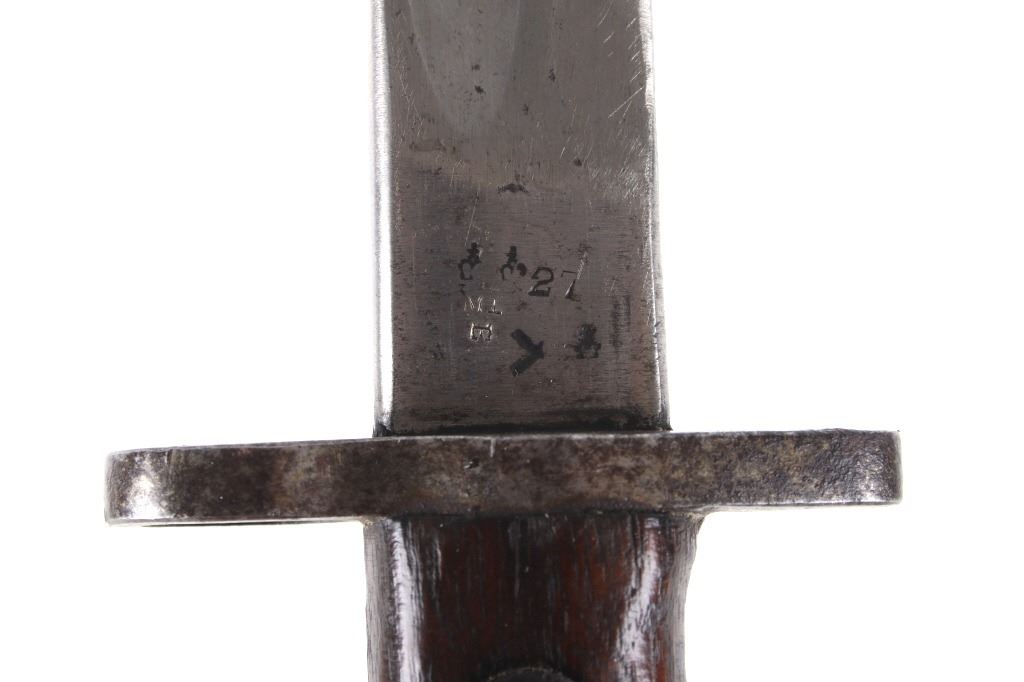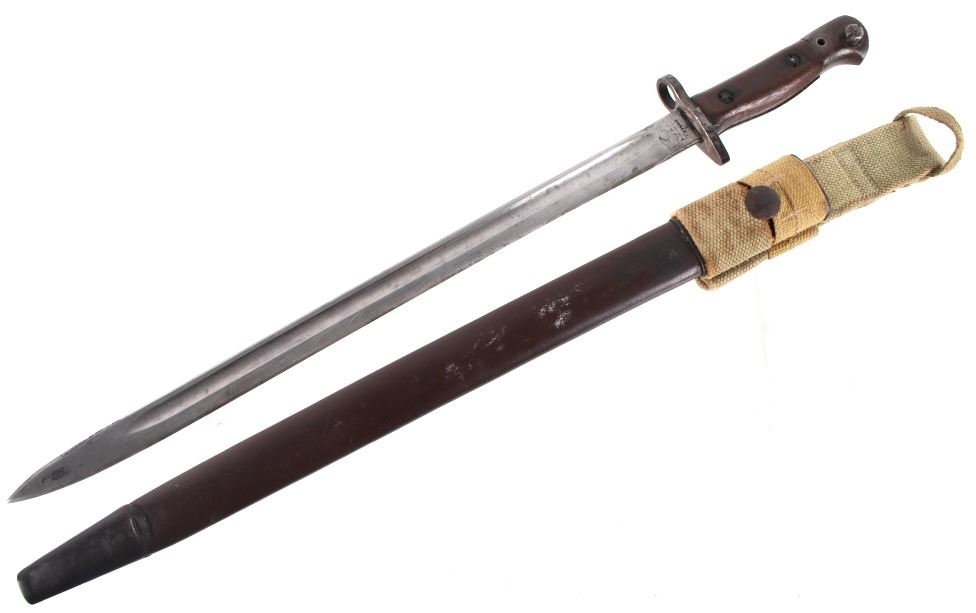 Featured in this lot we have a British pattern 1907 sword bayonet and sheath fitted for Lee-Enfield No. I Mk. III rifle. The Lee-Enfield is a bolt action magazine fed rifle chambered in .303 that was used in World War I. The bayonet depicts a long straight sword barrel, attachment guard, wood grips, and attachment pommel. The blade shows a fuller groove across both sides of the blade with a single cutting edge. The base of the blade is marked with faded manufacture and inspection stamps. The grip shows hard wood scales across the sides and functional attachment points on the pommel and back of the guard. The bayonet comes with a leather and metal sheath with canvas belt strap and the sheath marked across the back reading "Mangrovite '44". The piece shows good condition overall with light wear due to age and use. The bayonet measures 21 1/2" long with the blade being 16 1/2" long.