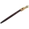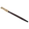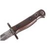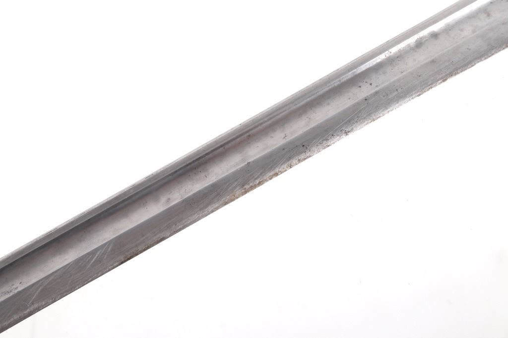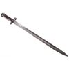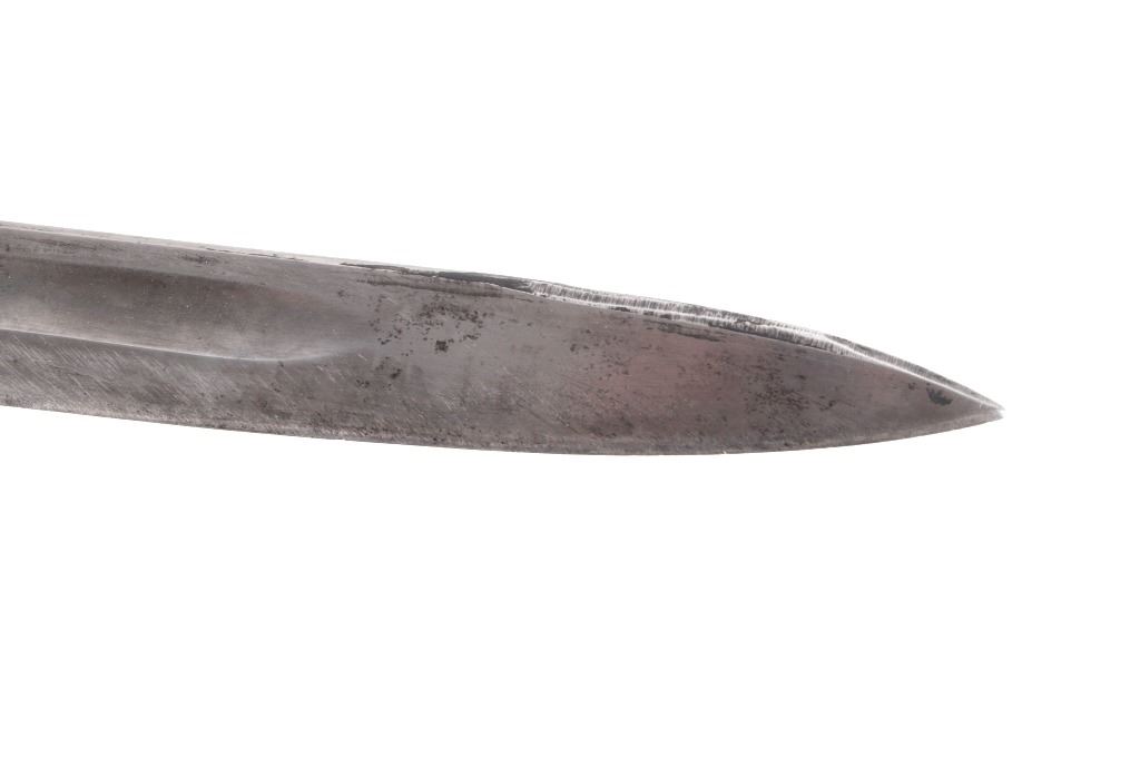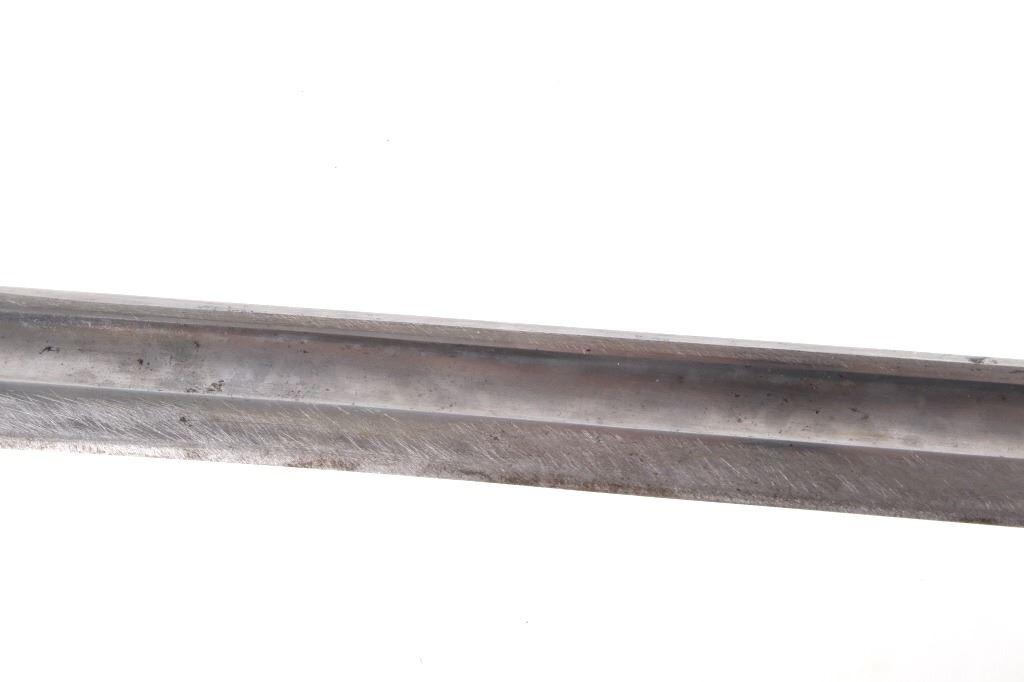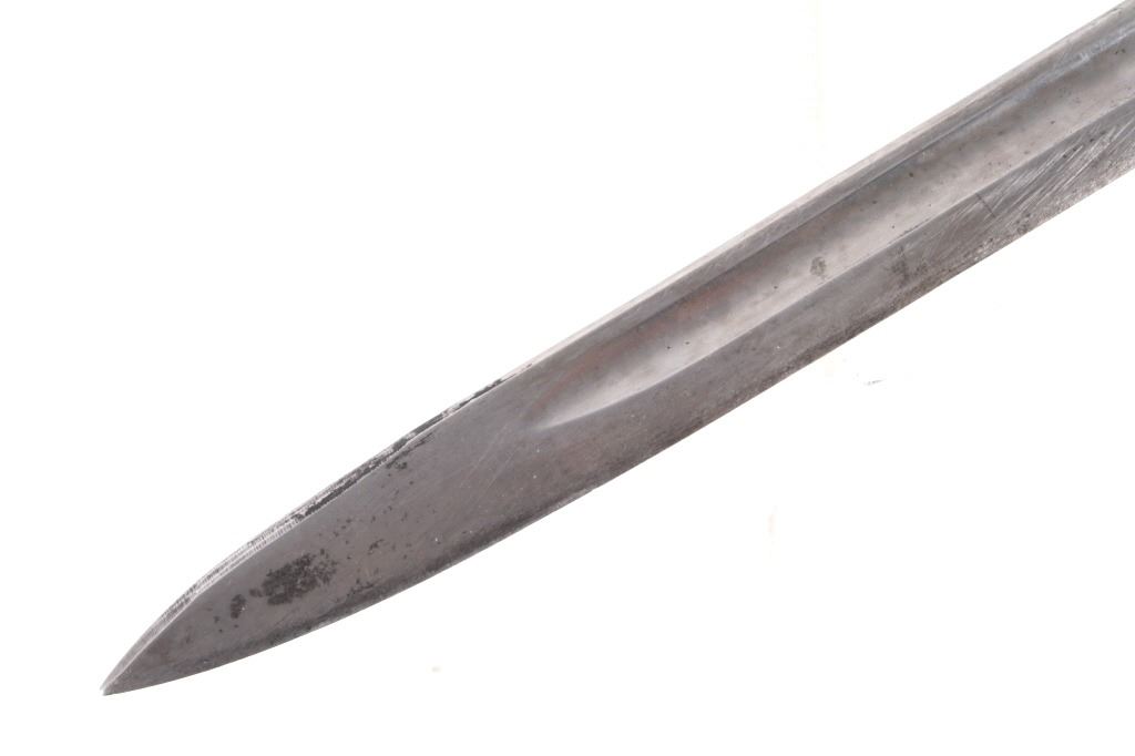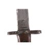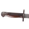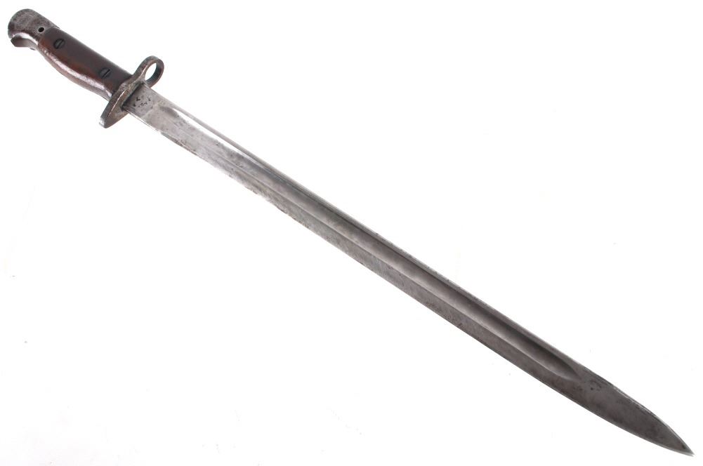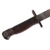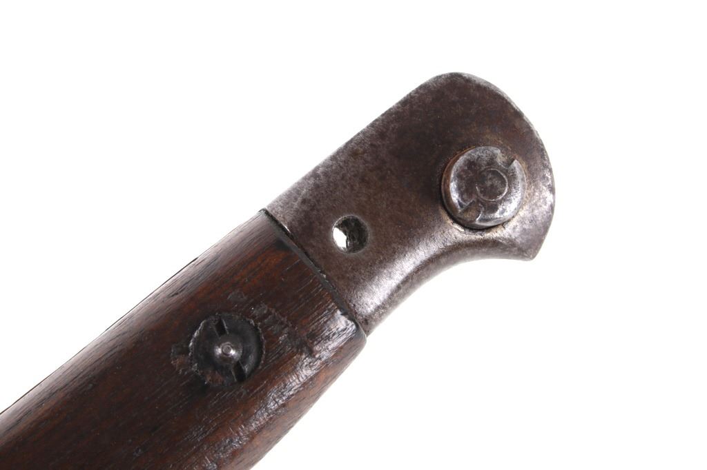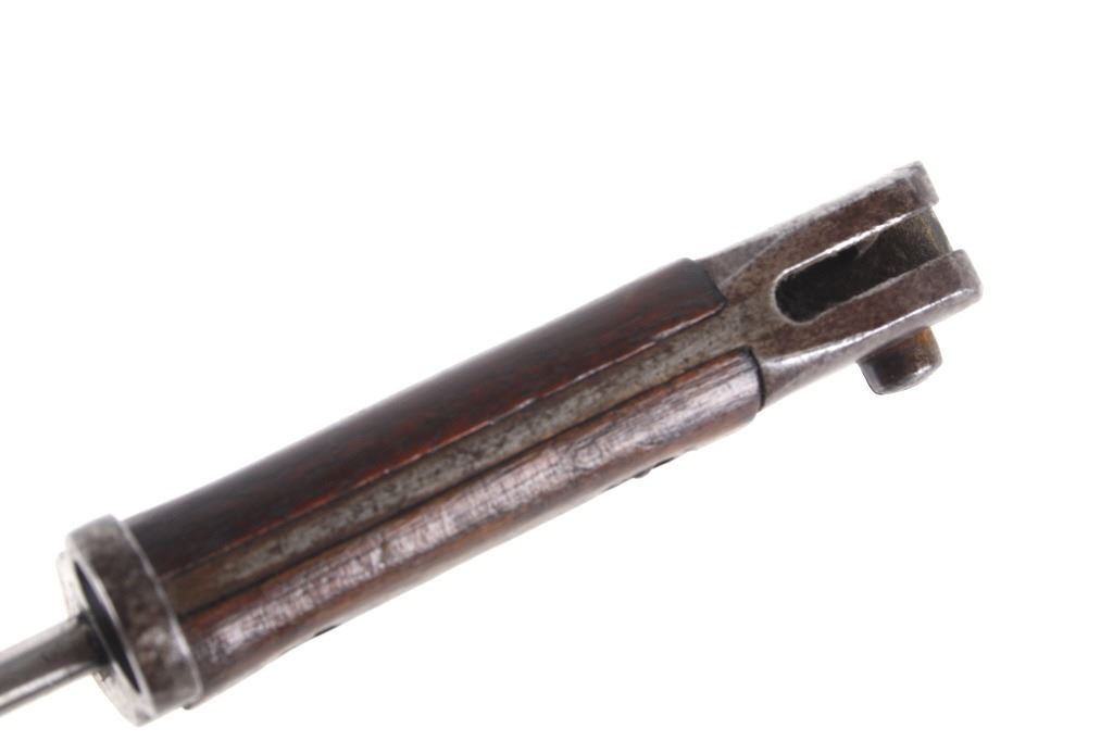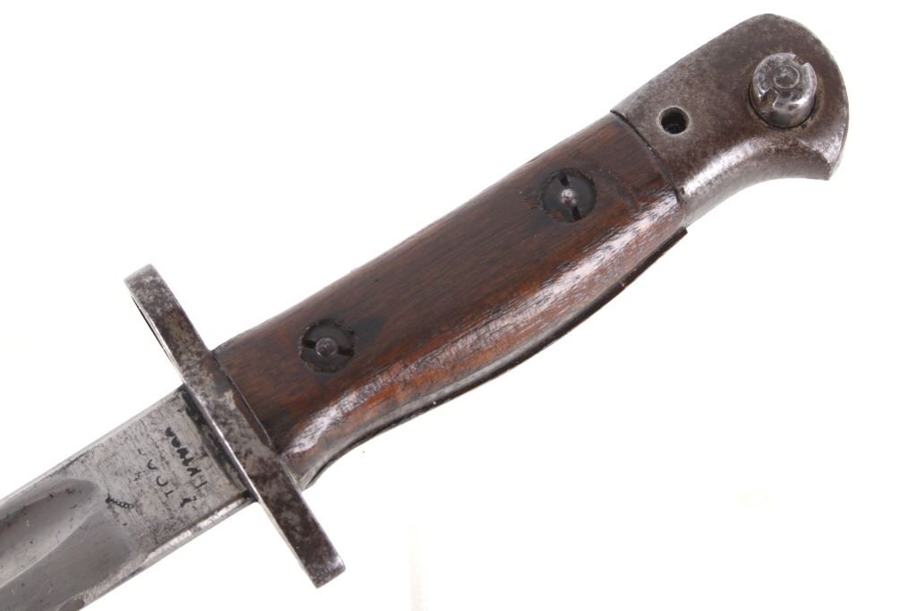Featured in this lot we have a British pattern 1907 sword bayonet and sheath fitted for Lee-Enfield No. I Mk. III rifle. The Lee-Enfield is a bolt action magazine fed rifle chambered in .303 that was used in World War I. The bayonet depicts a long straight sword barrel, attachment guard, wood grips, and attachment pommel. The blade shows a fuller groove across both sides of the blade with a single cutting edge. The base of the blade is marked with faded manufacture and inspection stamps. The grip shows hard wood scales across the sides and functional attachment points on the pommel and back of the guard. The bayonet comes with a leather and metal sheath with canvas belt strap and the sheath marked across the back reading "Mangrovite '44". The piece shows good condition overall with light wear due to age and use. The bayonet measures 21 1/2" long with the blade being 16 1/2" long.