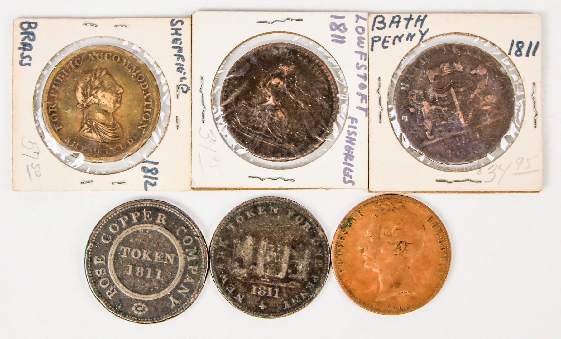 Lot of six coppers: 1811 Bath; 1811 Rose Copper Company Birmingham and Swansea; 1811 T. Stansall; 1811 Lowfstoft Fisheries; 1812 Sheffield; 1857 Professor Holloway.