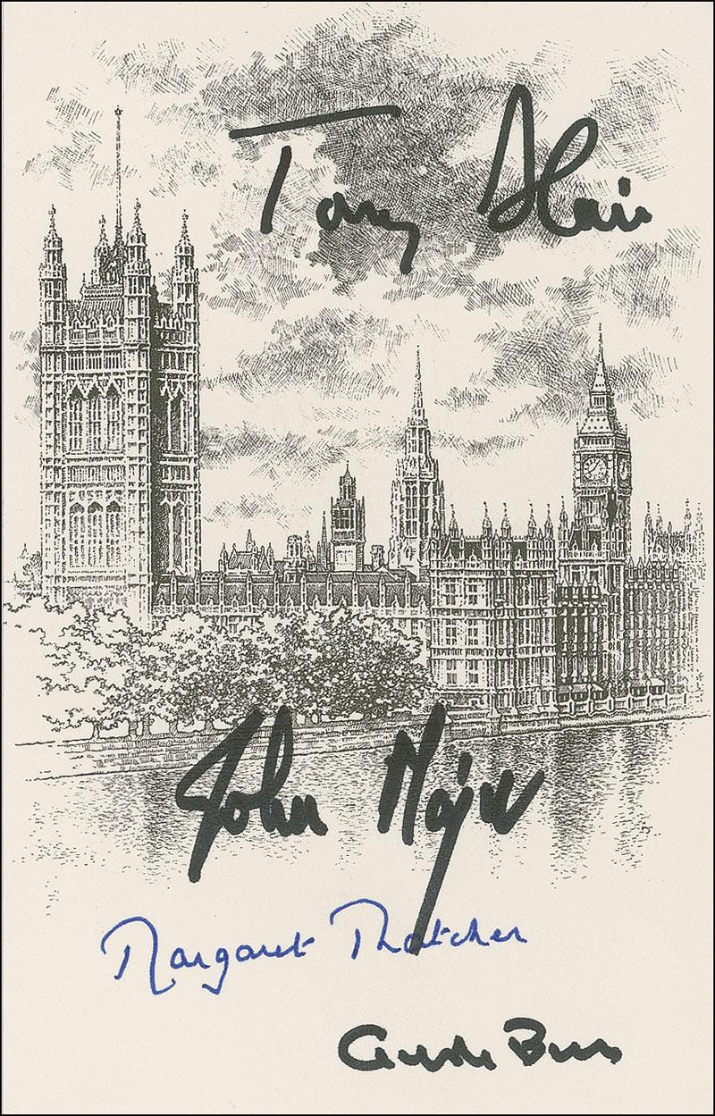 Bookplate, 3.75 x 5.75, featuring an image of Big Ben and Parliament, signed in blue ink by Margaret Thatcher and in black felt tip by John Major, Tony Blair, and Gordon Brown. In very fine condition.