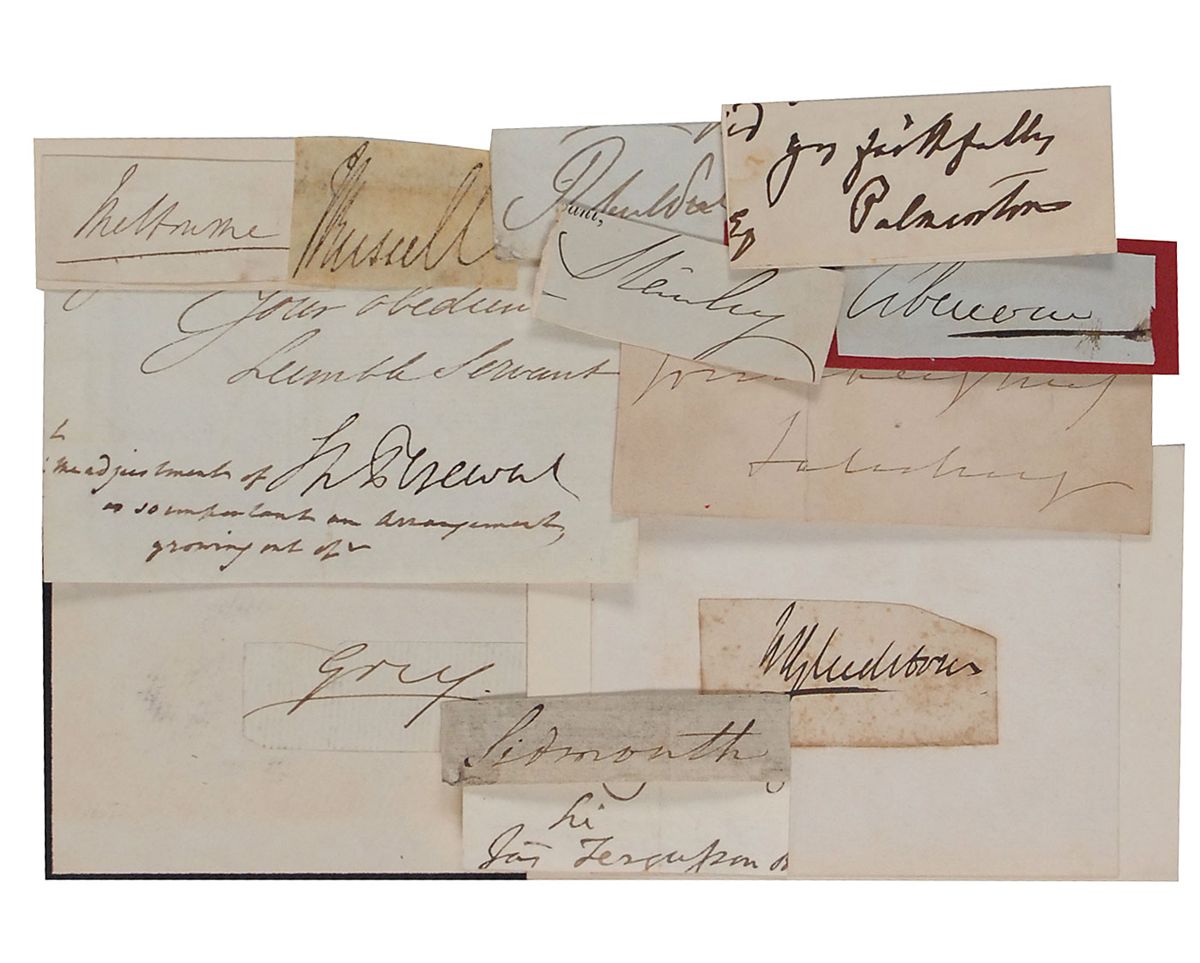 Collection of 11 ink signatures of 19th century British prime ministers on individual various size clipped slips. Signers include: Spencer Perceval, William Lamb, Charles Grey, George Hamilton-Gordon, Edward Smith-Stanley, John Russell, Henry John Temple, Benjamin Disraeli, Robert Peel, William Gladstone, and Robert Gascoyne-Cecil. In overall very good condition.