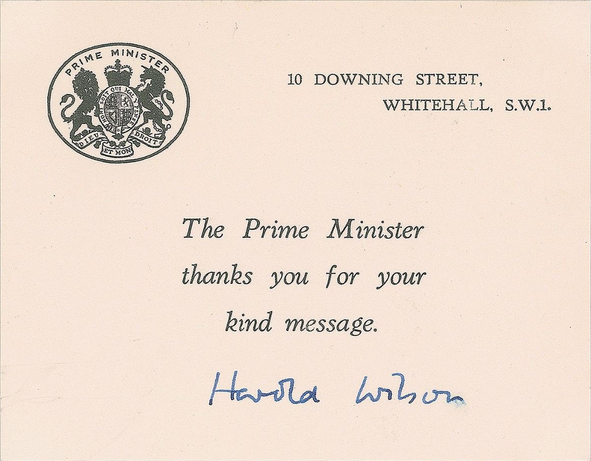 Collection of five items, each individually signed by a British prime minister, including: Harold Wilson (signature), Edward Heath (TLS), Gordon Brown (SP), John Major (SP), and Margaret Thatcher (signature). In overall fine condition.