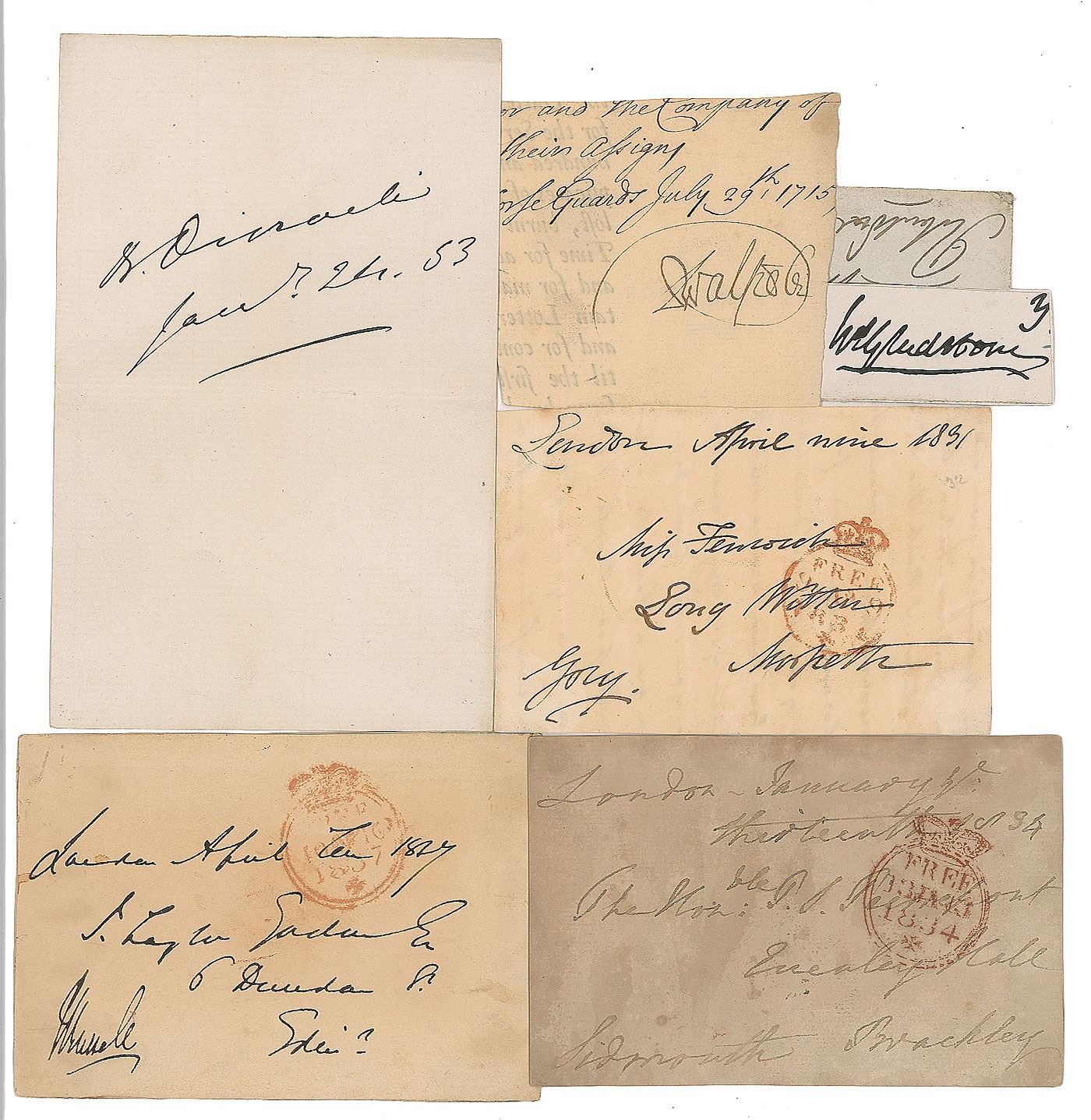 Collection of seven ink signatures of 18th and 19th century British prime ministers on clipped slips and free franks, including: Sir Robert Walpole (1st Prime Minister), Charles Grey, Lord John Russell, Henry Addington (The Viscount Sidmouth), William Ewart Gladstone, Sir Robert Peel, and Benjamin Disraeli. In overall very good to fine condition.