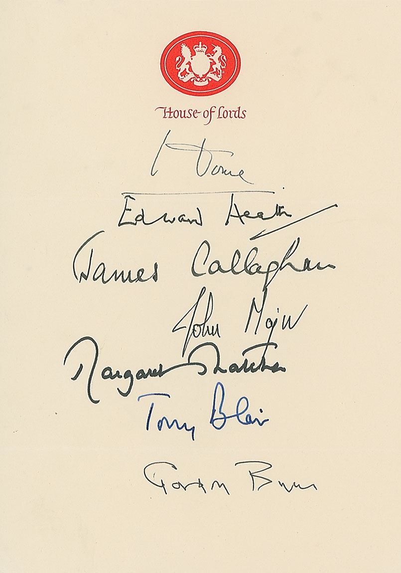 Appealing off-white 5.75 x 8.25 House of Lords stationery signed in ink or fountain pen by seven former British prime ministers: Tony Blair, Gordon Brown, James Callaghan, Alec Douglas-Home, Edward Heath, John Major, and Margaret Thatcher. In fine condition. Accompanied by three letters of transmittal from the offices of Blair and Callaghan. Consignor notes that the Brown autograph was obtained in person following a luncheon speech at Montreal's Hotel Bonaventure on March 25, 2015.